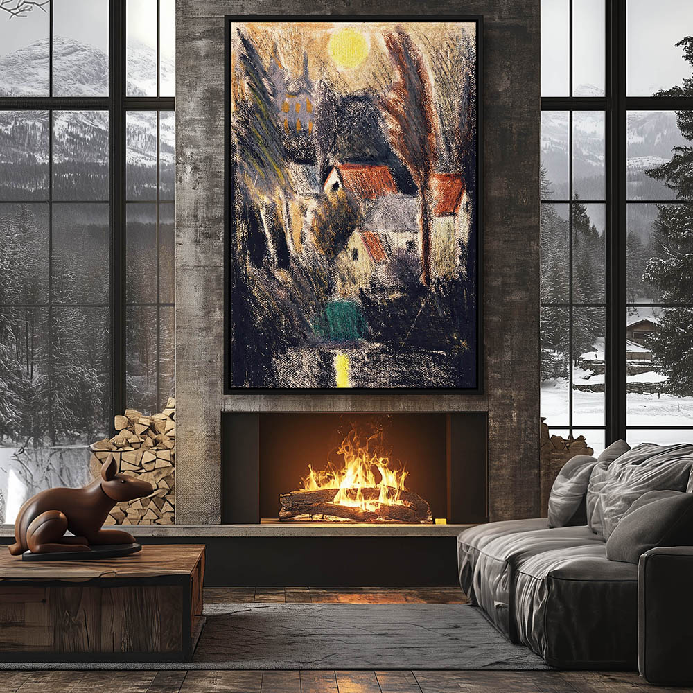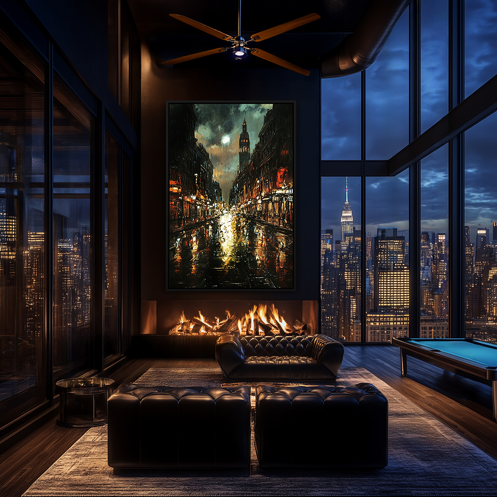 Dark and moody cityscape painting of a street view at night, perfect for home décor, wall décor, or as a striking piece of wall art. Available as a painting, stretched canvas, metal wall art, metal prints, framed prints, fine art prints, poster art, or canvas wall art framed with floater frames.