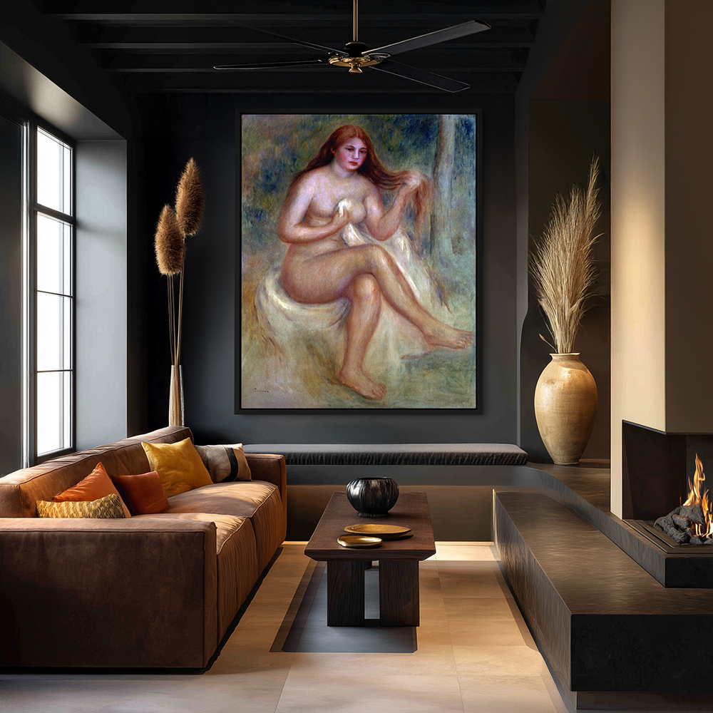 Pierre Auguste Renoir paintings featuring a seated nude woman make stunning home decor. These vintage artworks are available in five different formats, including metal prints, stretched canvas, framed prints, fine art prints, and vinyl wall peels. Framed canvas wall art comes with options for black, white, or brown floater frames, providing a classic and elegant touch to any space.
