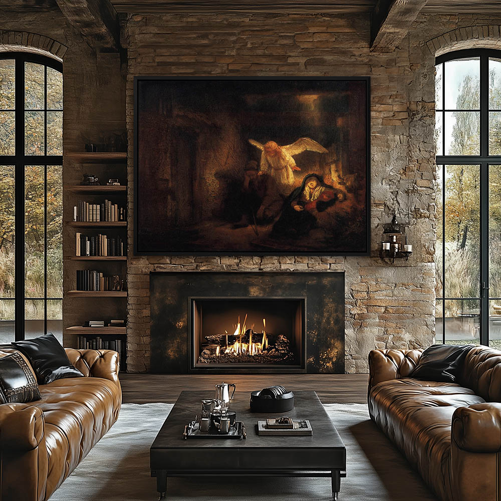 The vintage art painting by Rembrandt, depicting Joseph’s dream with an angel, is a timeless masterpiece that complements modern home decor beautifully, making it a standout statement piece in any setting. It comes in a variety of sizes to fit any space and offers numerous formats, including metal prints, metal wall art, framed prints, framed wall art, poster art, poster prints, poster wall art, fine art prints, vinyl wall art, peel-and-stick vinyl, stretched canvas, and framed canvas wall art. You can also select from black, brown, or white floater frames to suit your style.