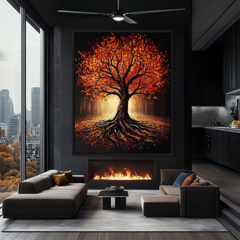 A large landscape painting of a tree in autumn is available in five different formats: stretched canvas wall art, framed prints, fine art prints, poster prints, and poster wall art. Additional options include vinyl wall peel, vinyl peel and stick, metal wall art, metal prints, and framed canvas wall art with floater frames.