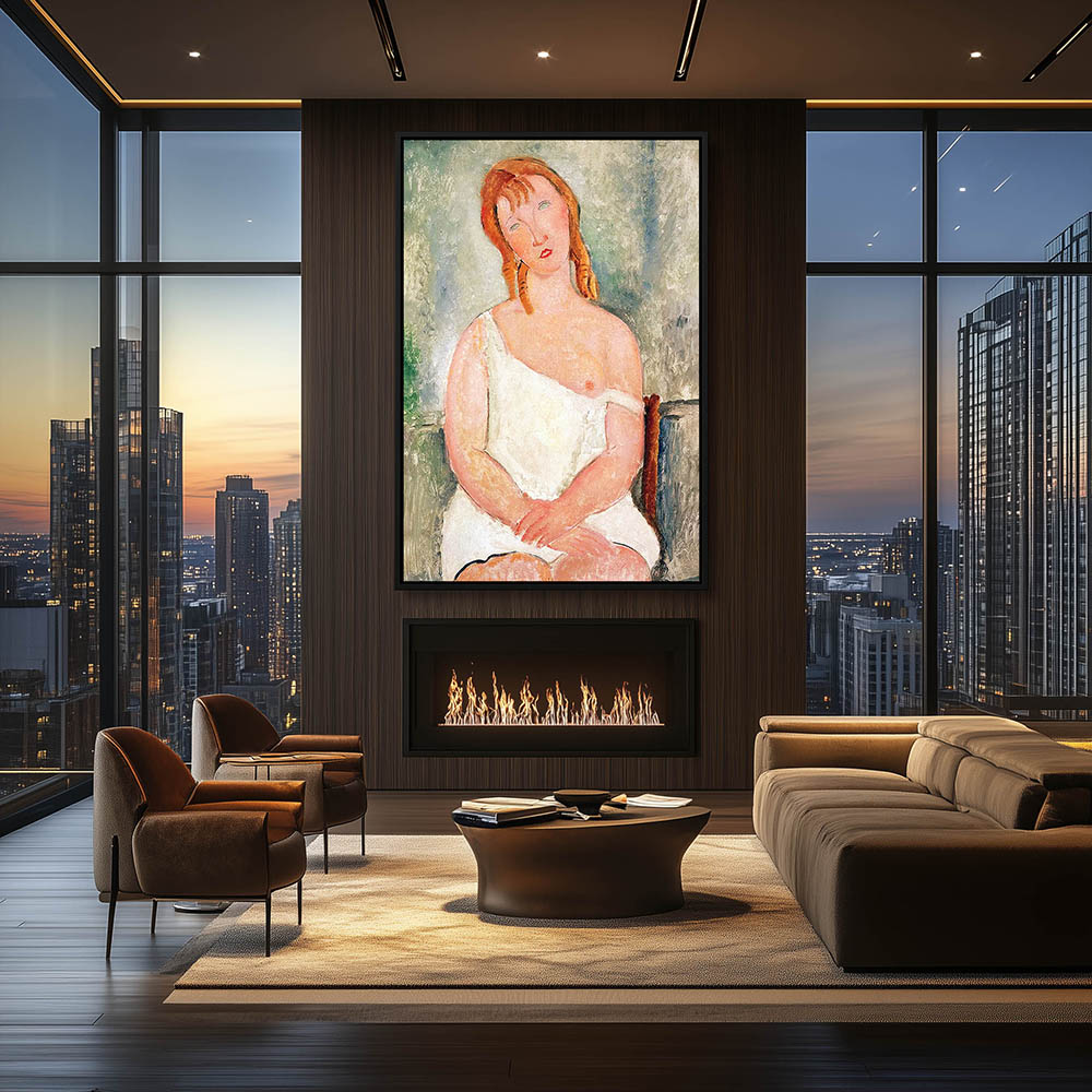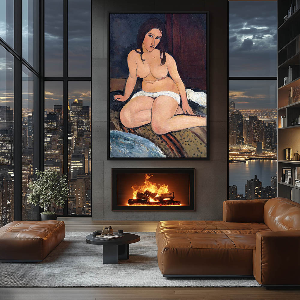 Abstract Figurative Painting of a Half Nude Woman Sitting on a Bed