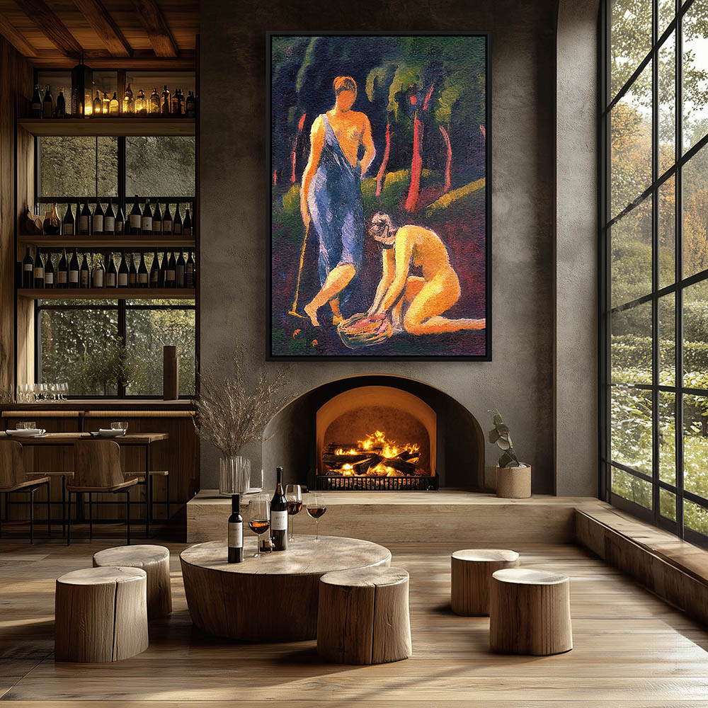 Abstract Figurative Painting with Two Nude Women Working in a Garden