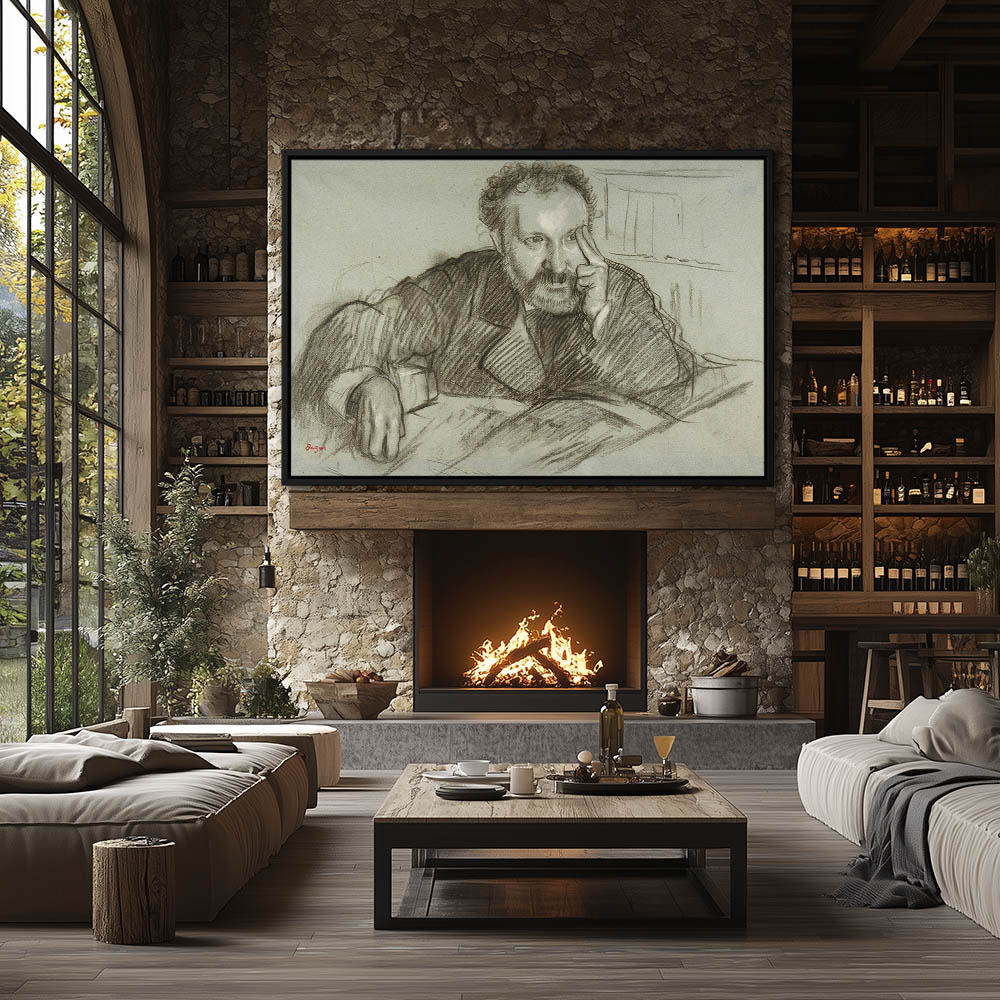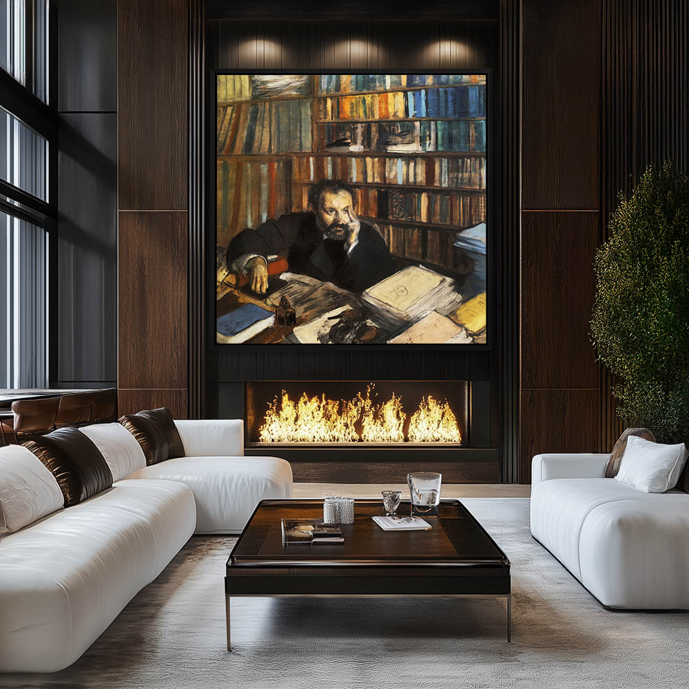 Portrait of Duranty in his office or library, at a paper strewn desk in front of filled bookshelves