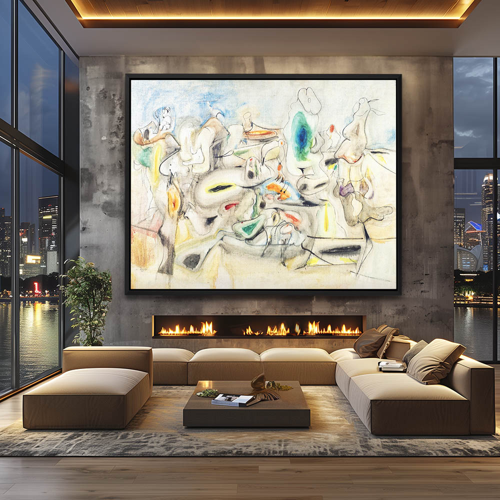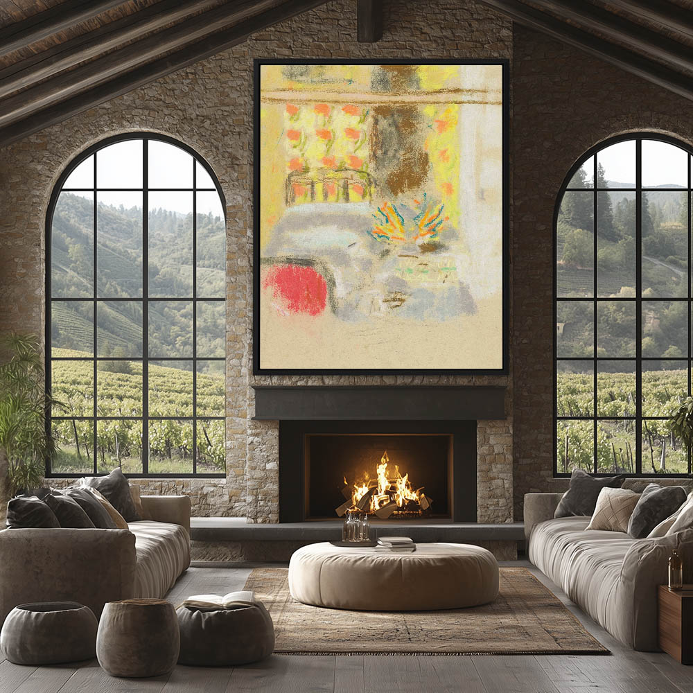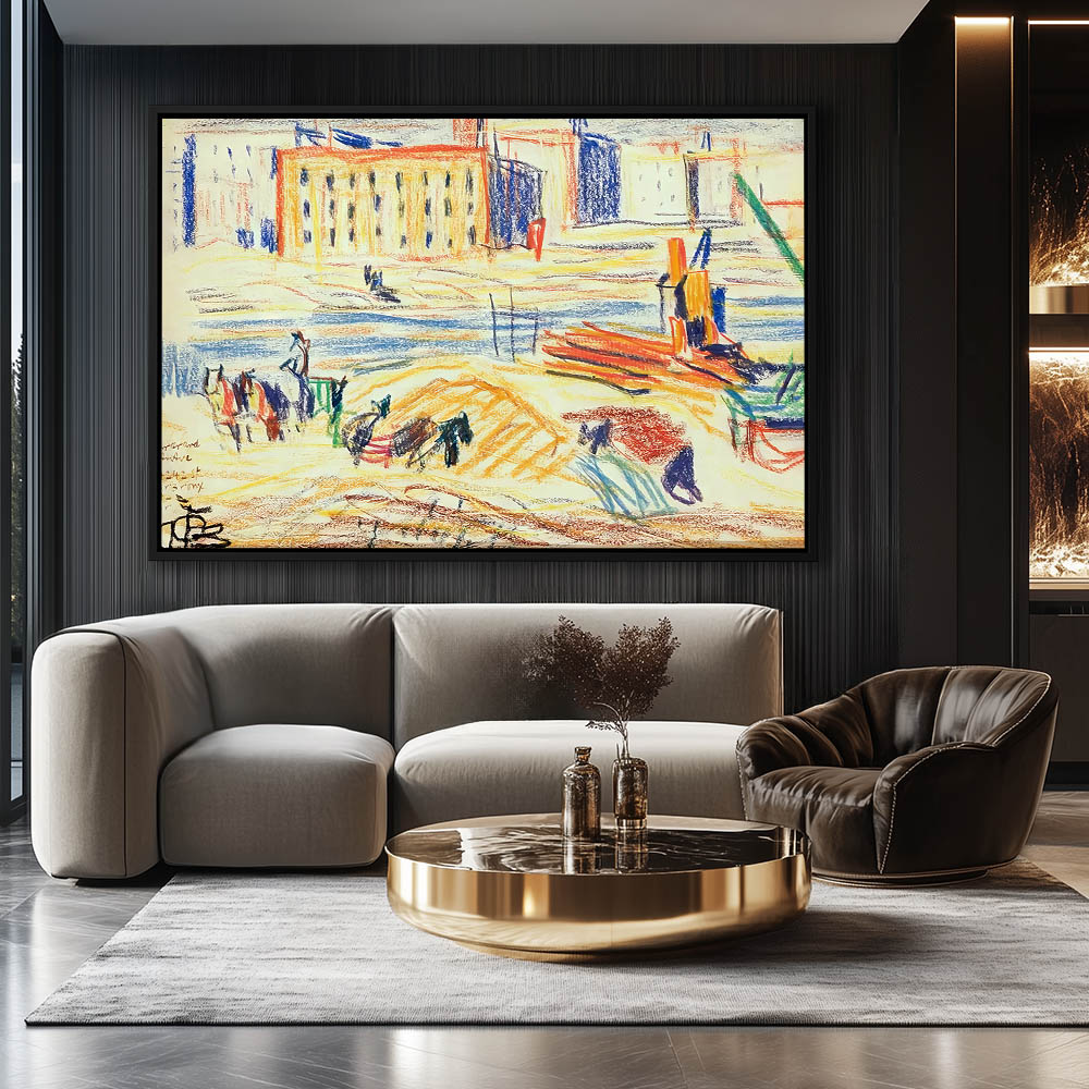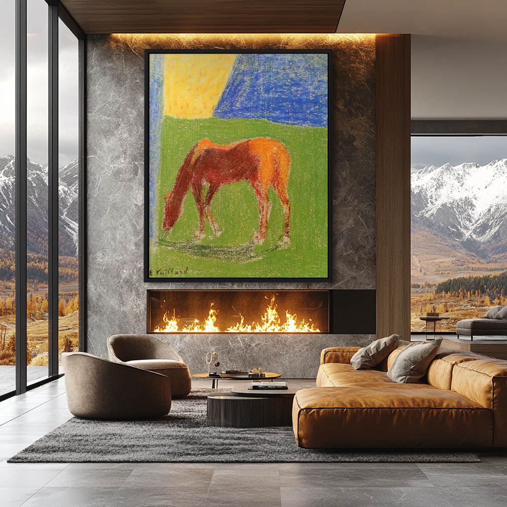 Abstract depiction of a horse on a field of green with yellow and blue swatches in the background