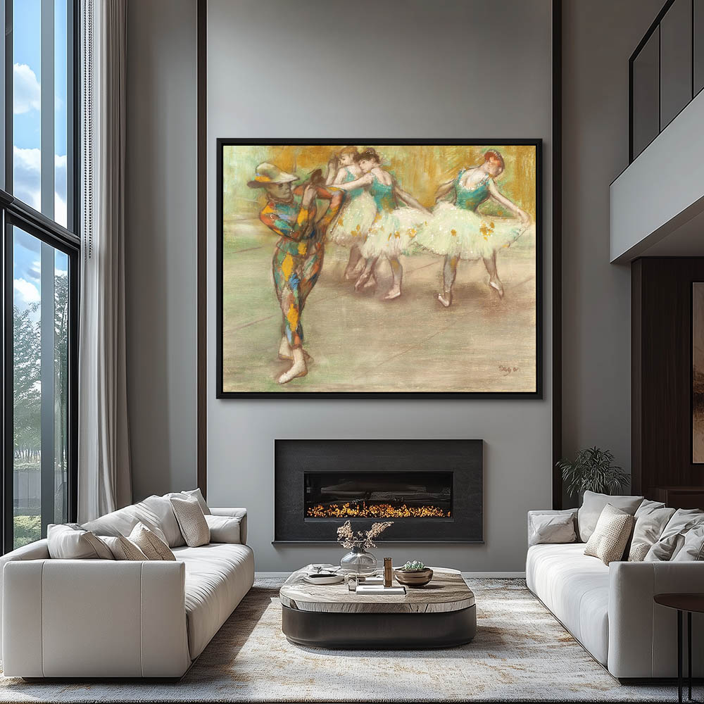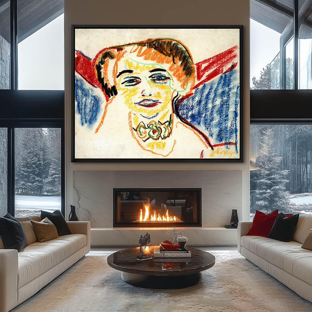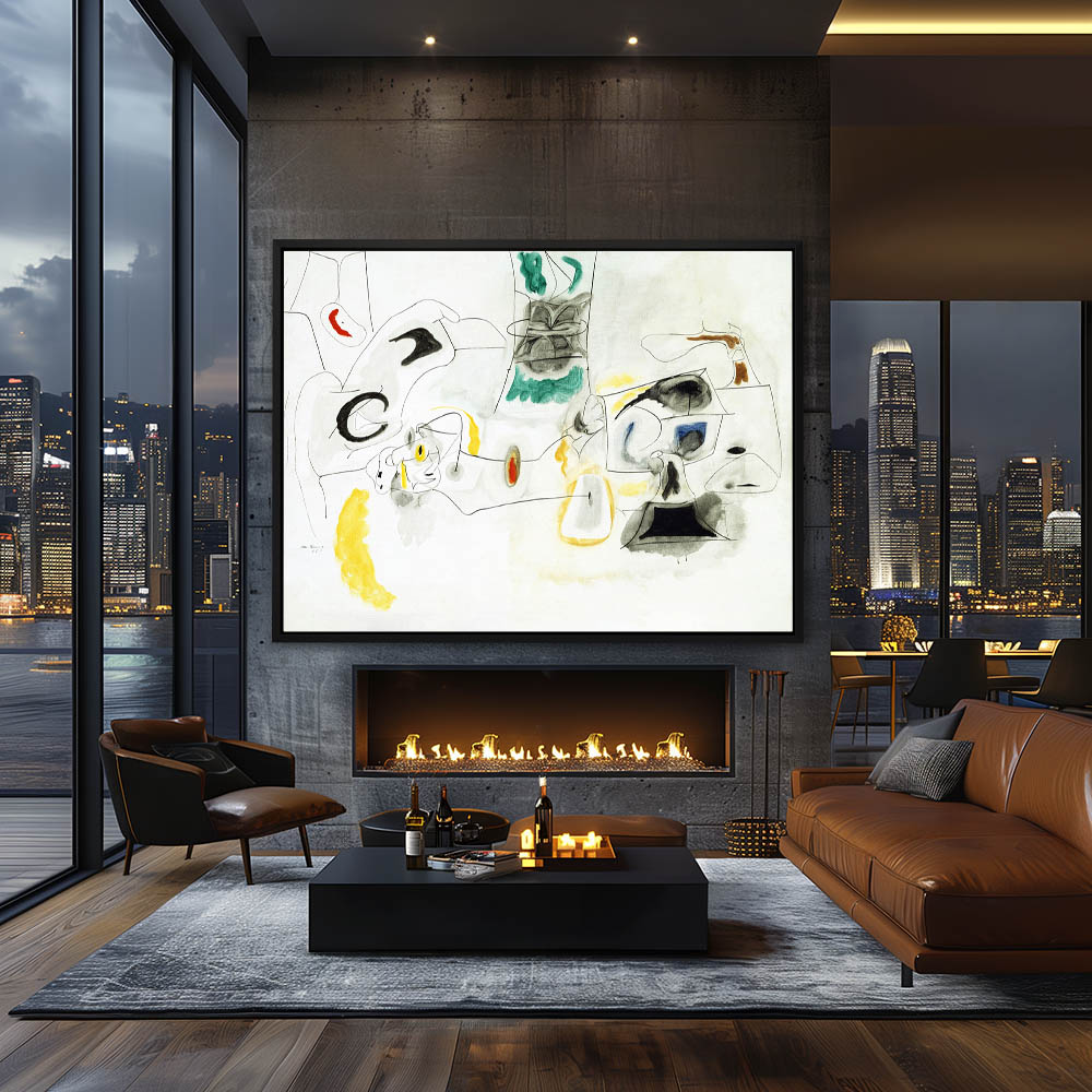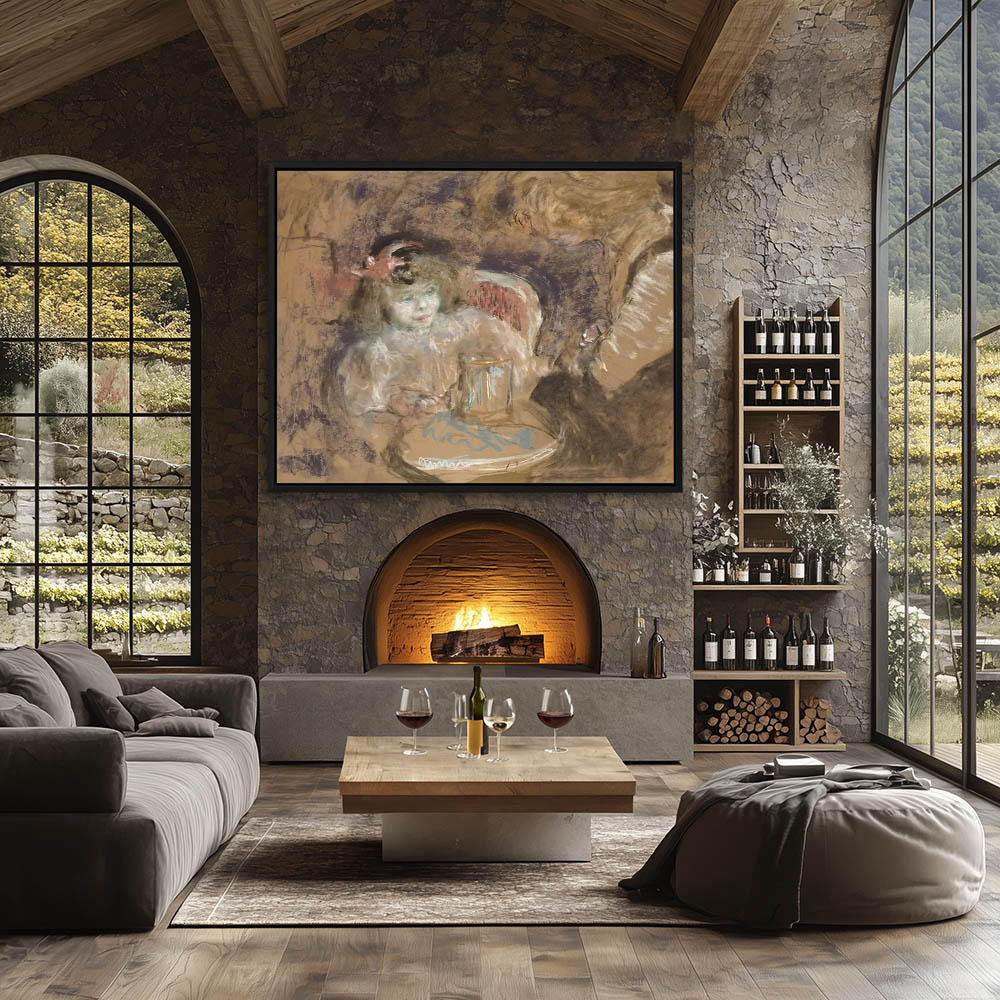 Abstract depiction of a horse on a field of green with yellow and blue swatches in the background