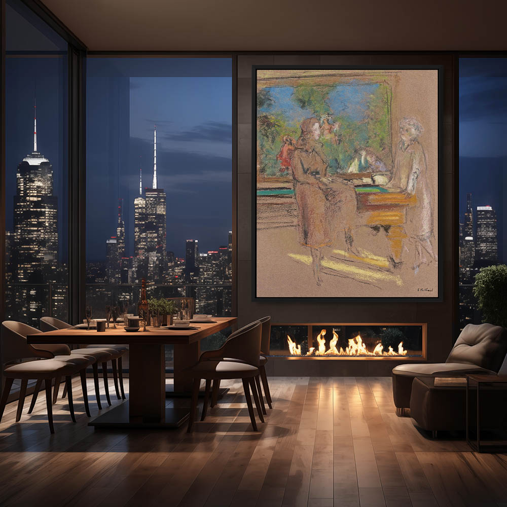 Two women working in a laundry, one reads from a paper held up high and the other leans forward resting on the table while laundry can be seen folded and hanging about the room