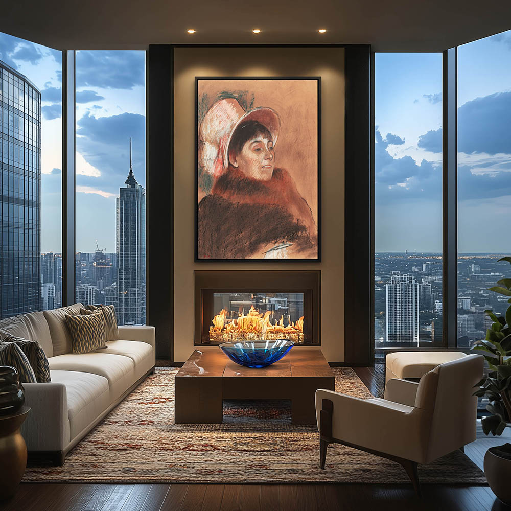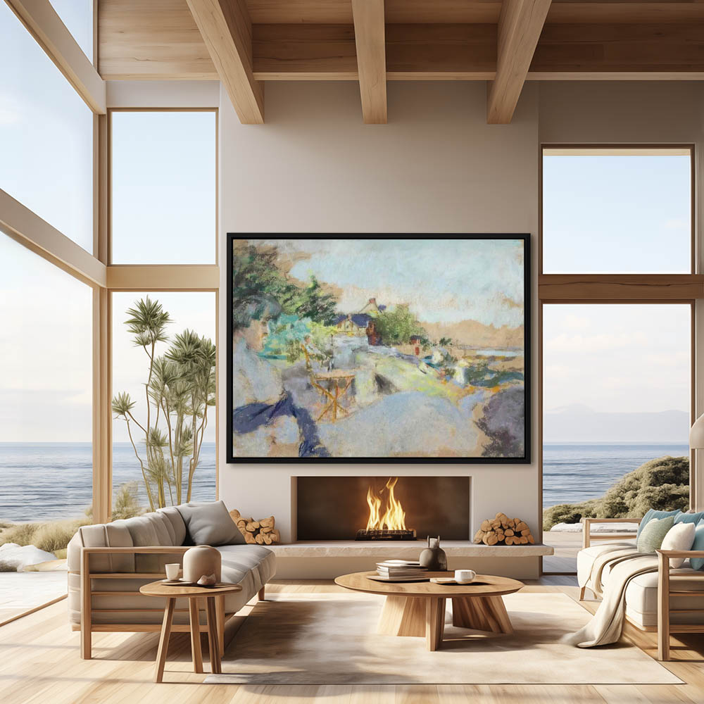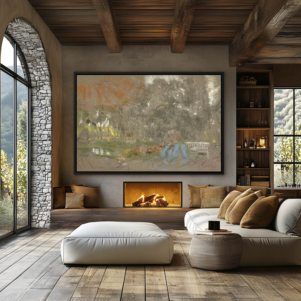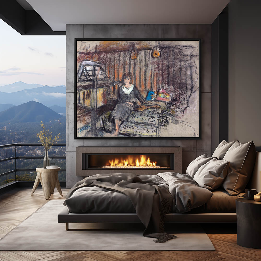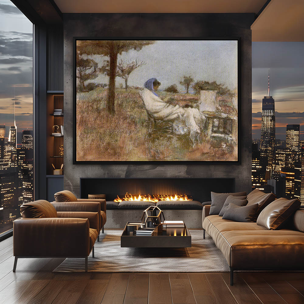 Abstract composition of a woman overlooking a village