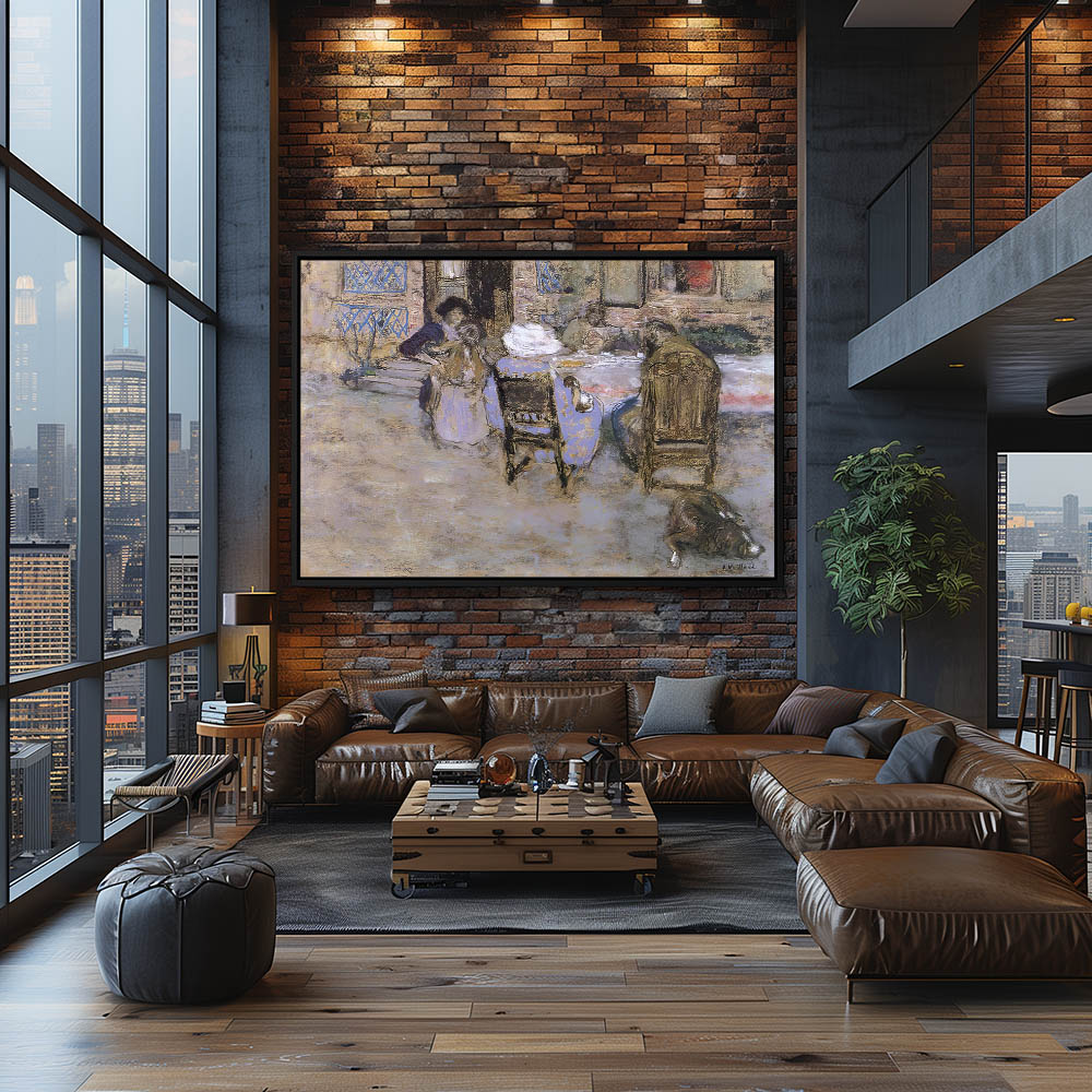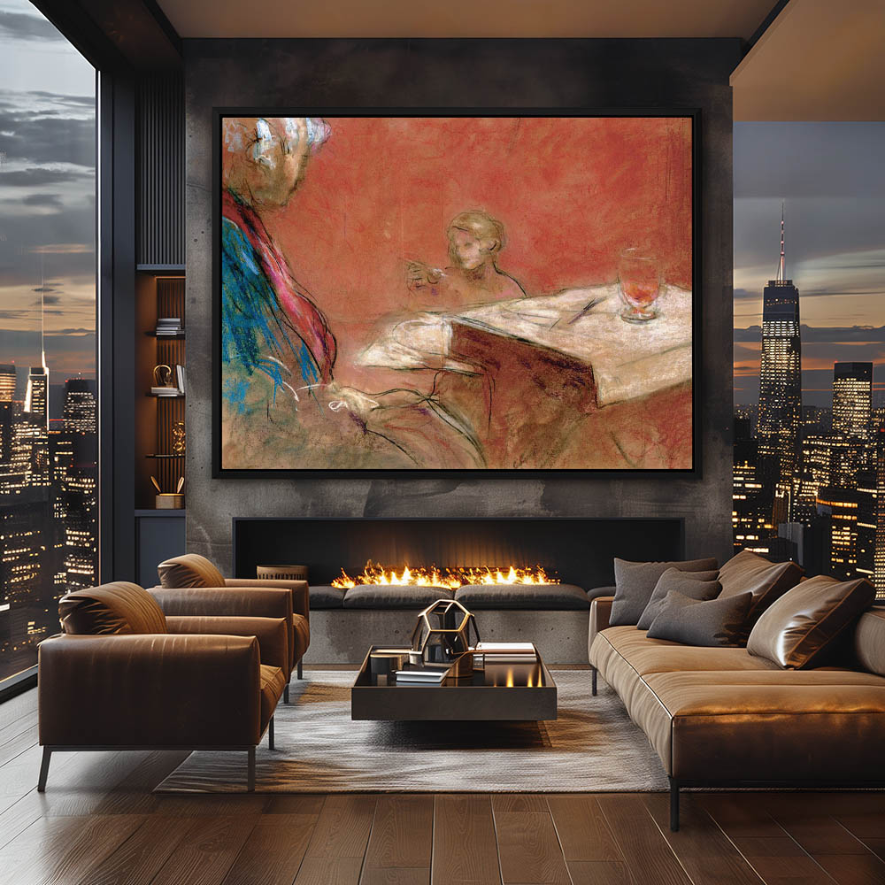 Abstract sketch of two women at a table, on a red background