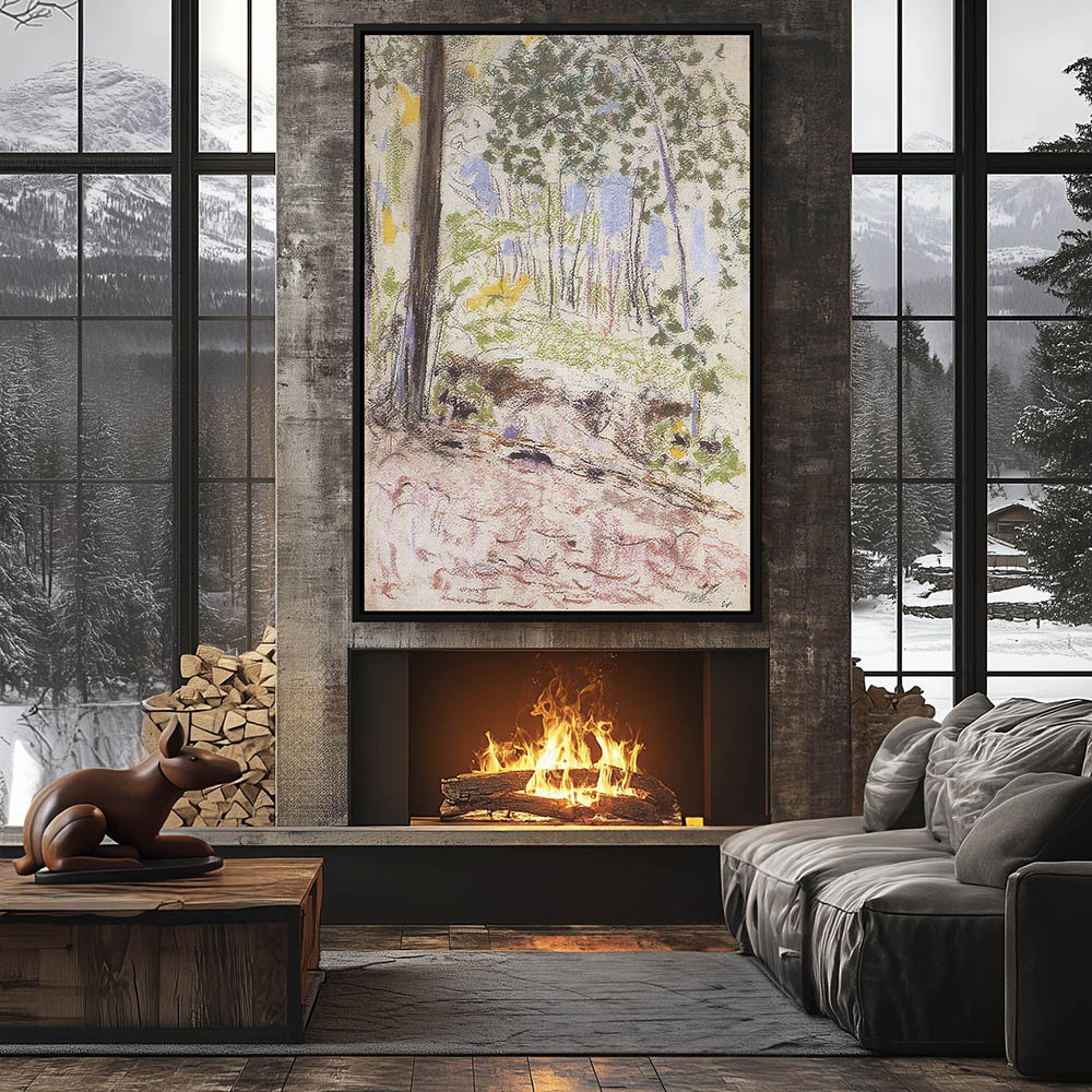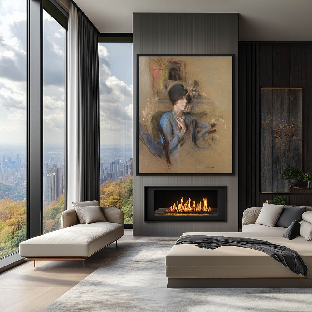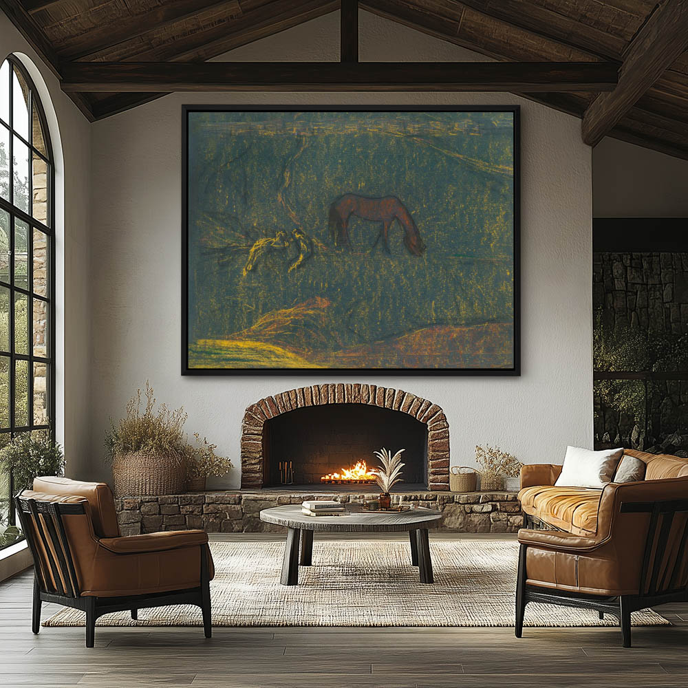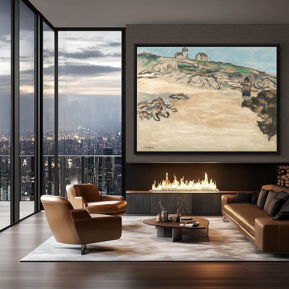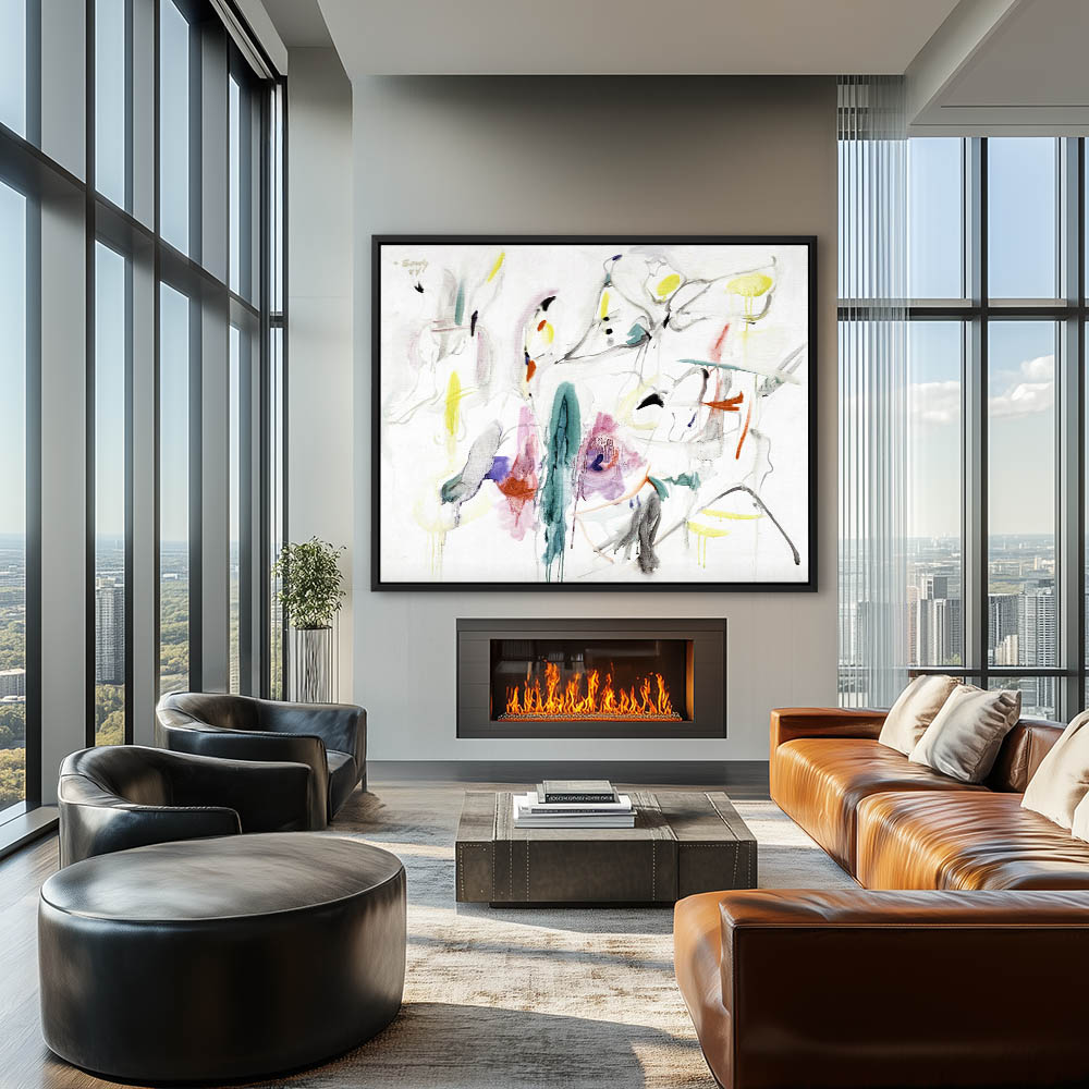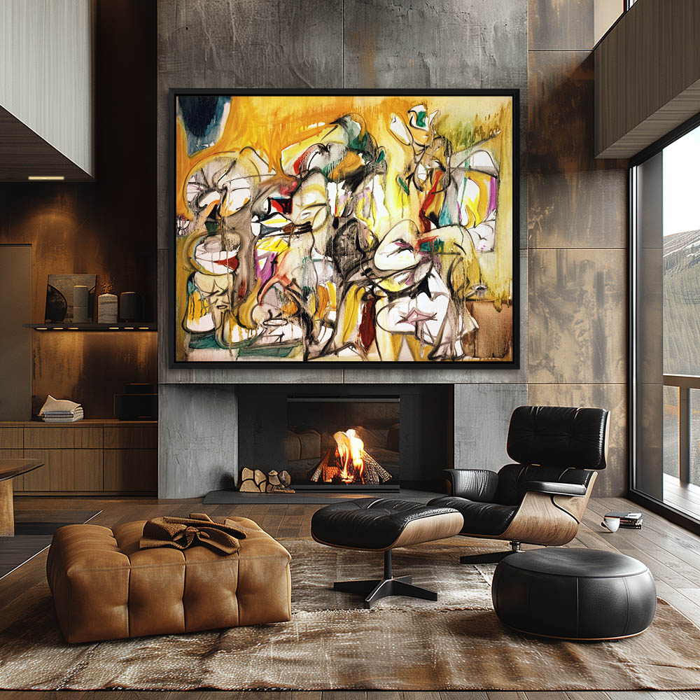 Abstract interior with two red floral arrangements, a sofa and a billiards table with a large painting on a far wall.