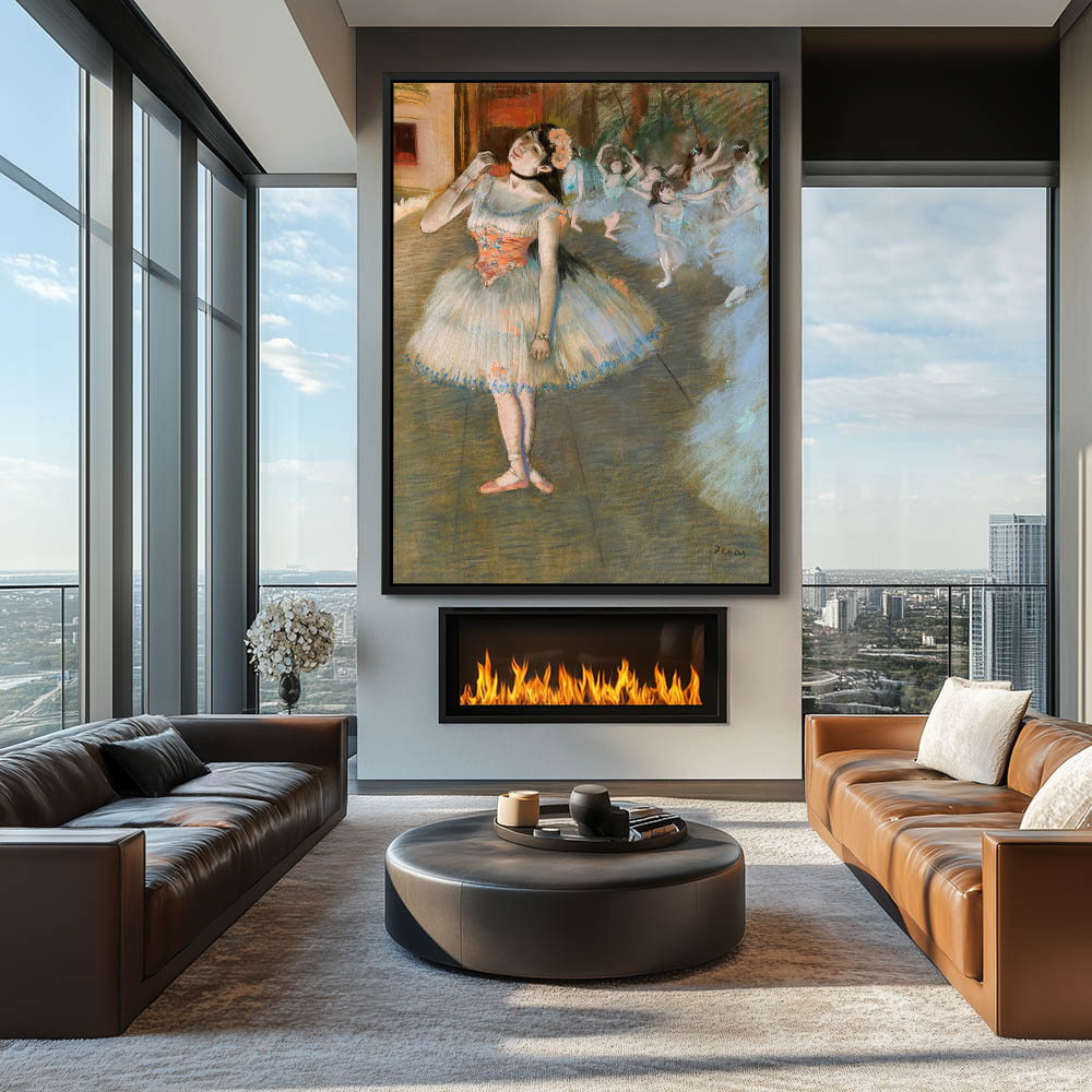 Ballerina in arabesque on pointe on stage in costume with hints of blue with red flowers