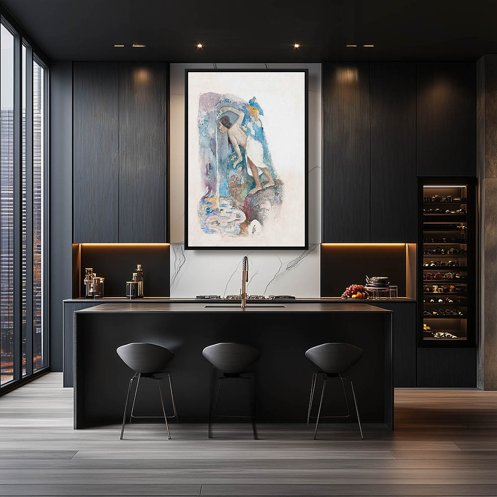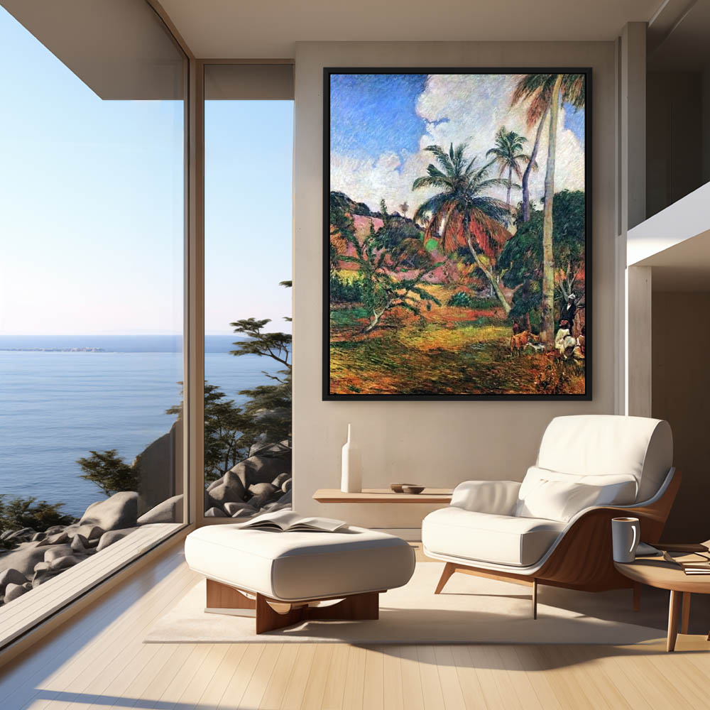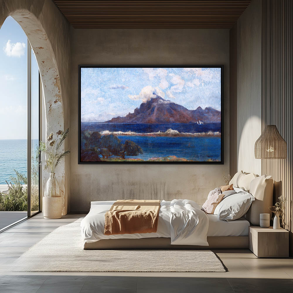 Vintage Landscape Painting with a Mountain in the Distance across the Sea