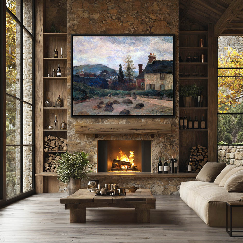 Vintage Landscape Painting with a Farm House and Figures Returning from Work