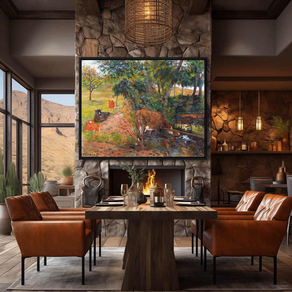 Vintage Farm Landscape with Cows Resting and Drinking Water