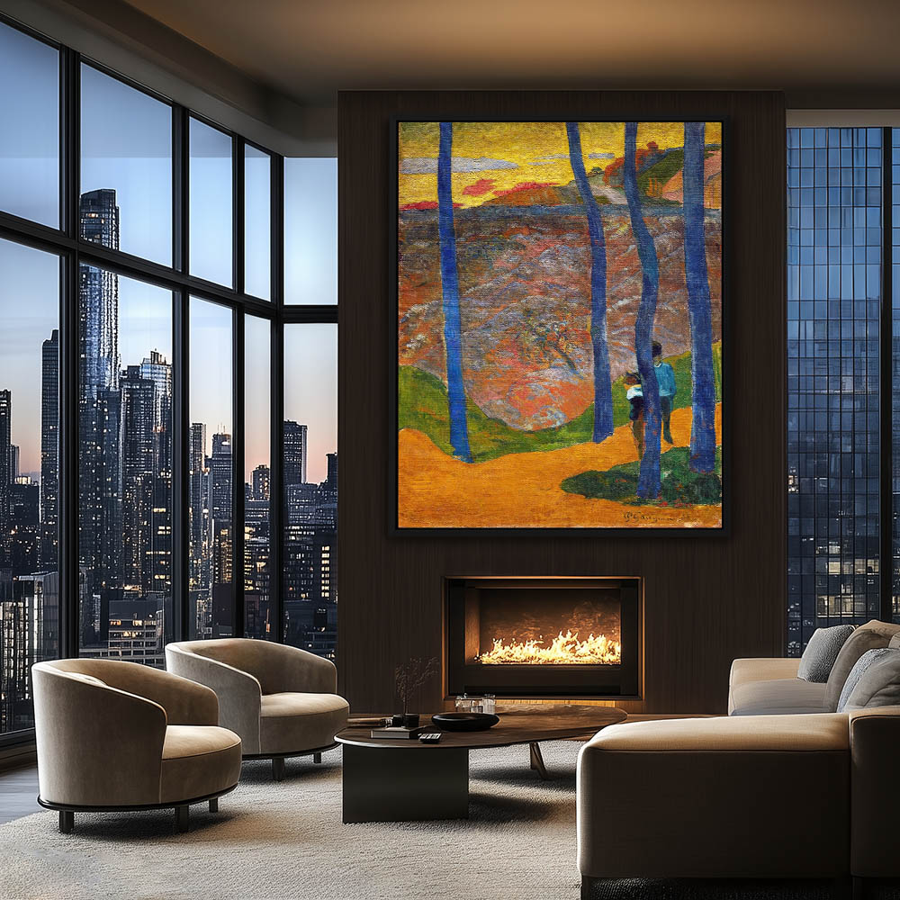 Vintage Landscape Painting with Figures walking among the Blue Trees