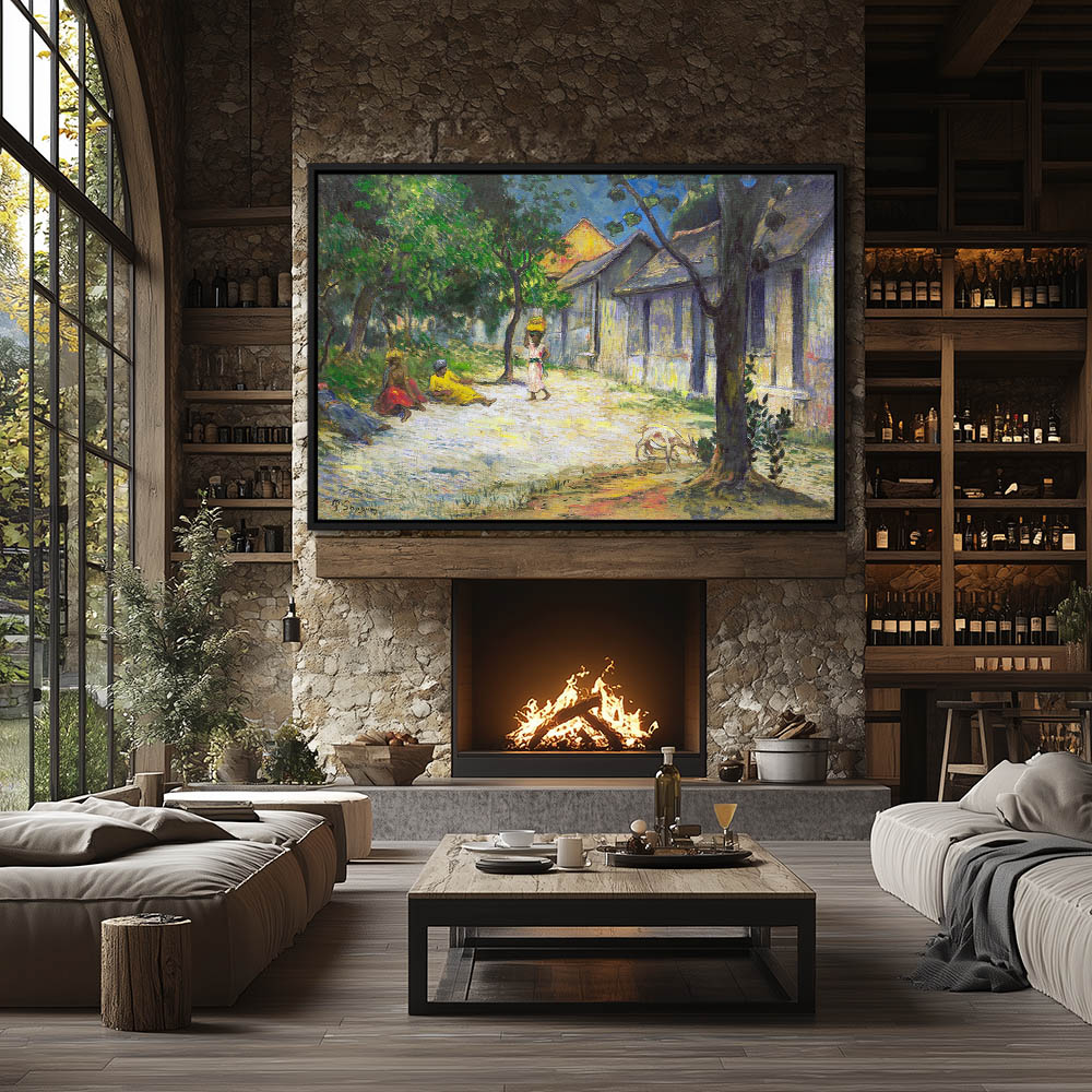 Vintage Landscape Painting with Figures in a Street of the Village