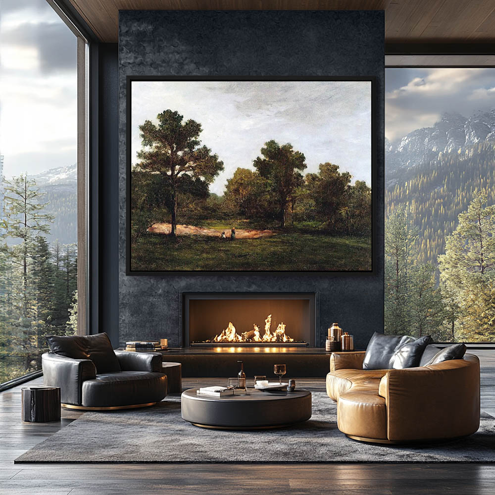 Vintage Abstract Landscape Painting with Figures Walking a Trail and Goats