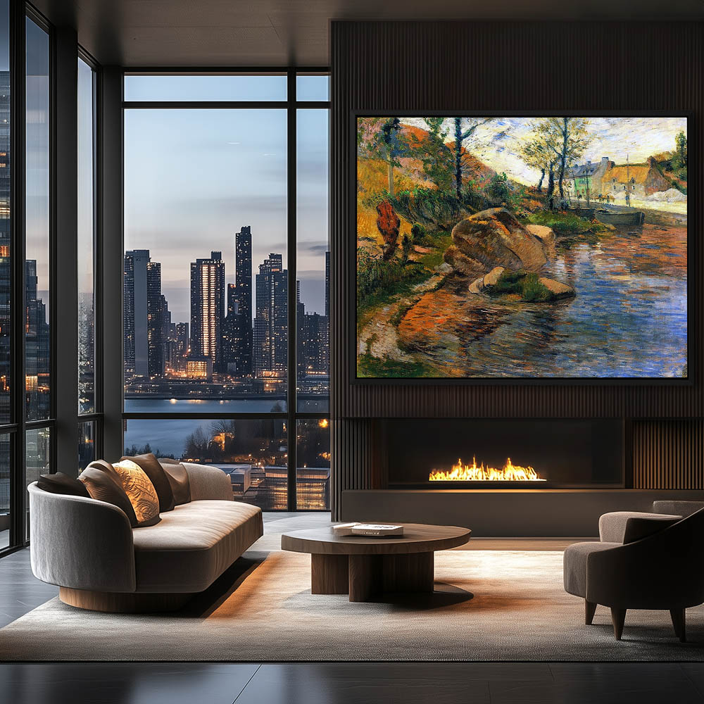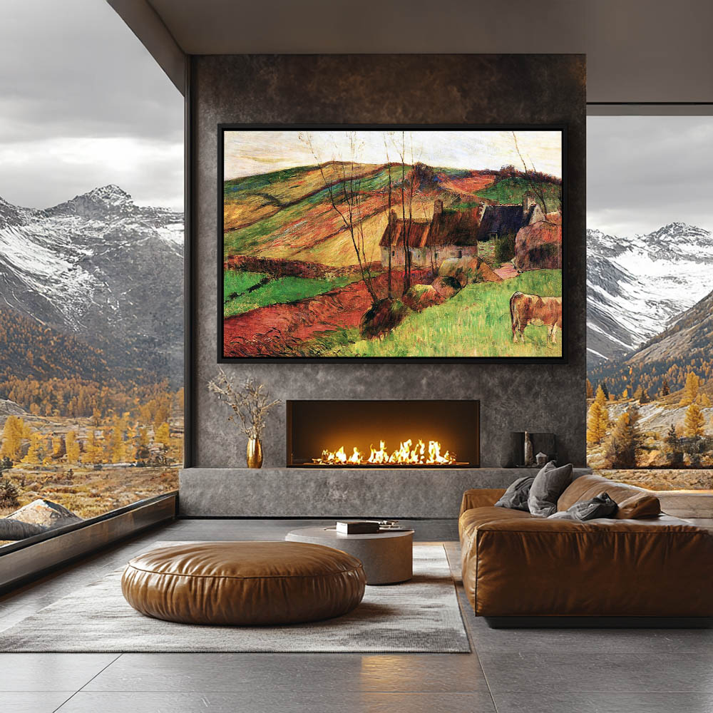 Vintage Farm Landscape Painting with a Cottage and a Cow