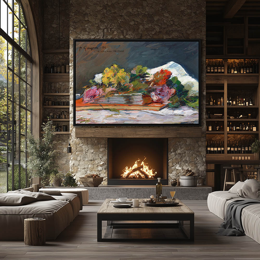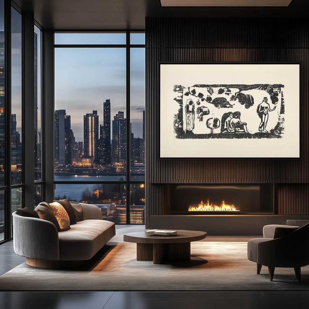 Vintage Landscape Painting with Figures gathered around a Fire by the Water