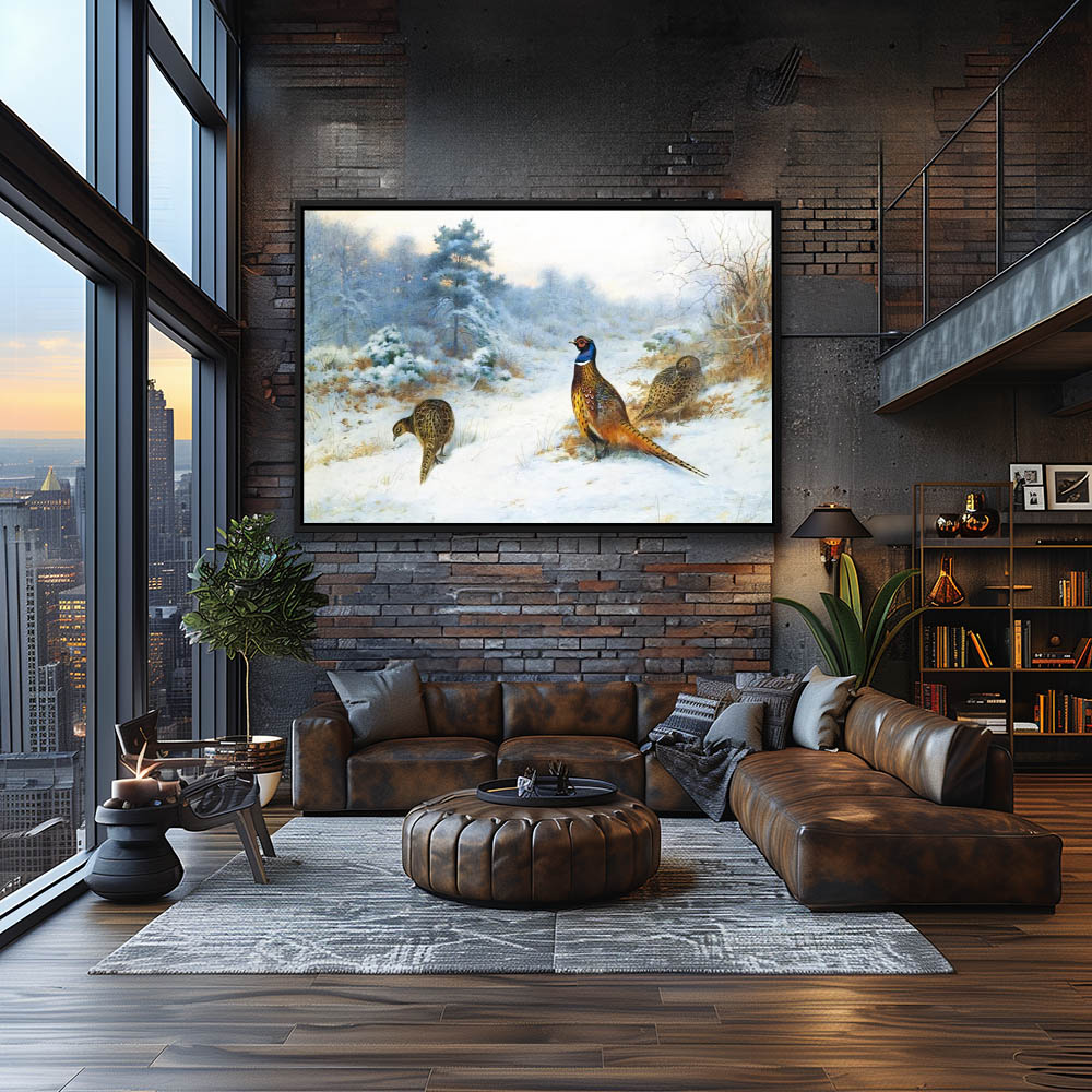 Snowy Winter Landscape Painting with Cock and Two Hen Pheasants