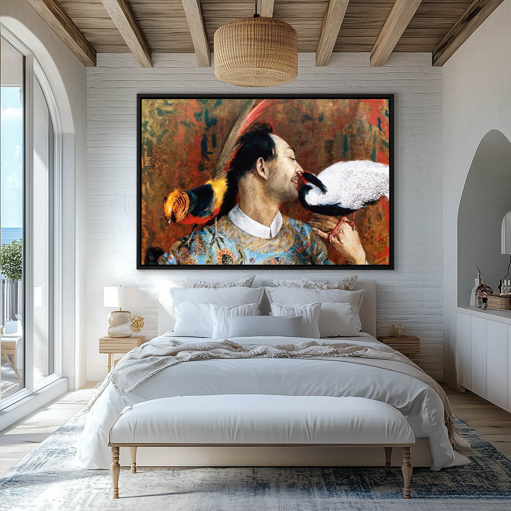 Vintage Figurative Painting of a Chinese man with Pheasants