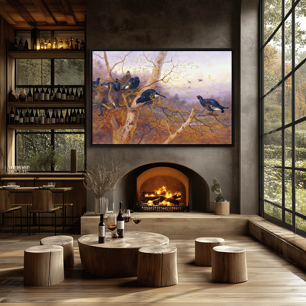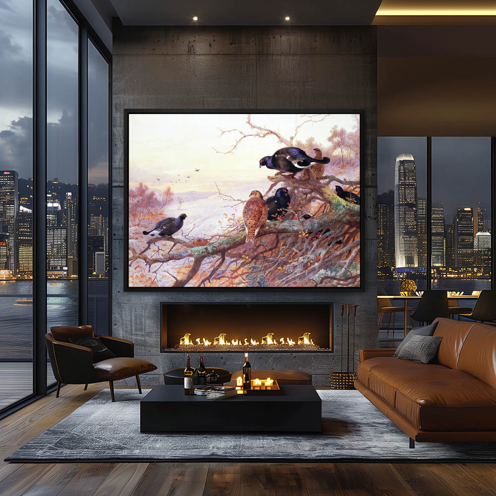 Forest Landscape Painting with Blackgame Birds Perched in a Tree