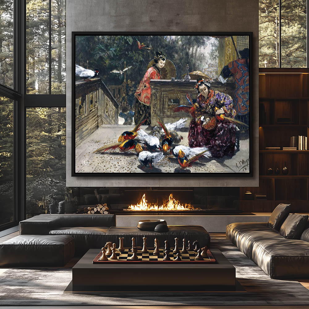 Vintage Figurative Painting of Chinese Women with Pheasants