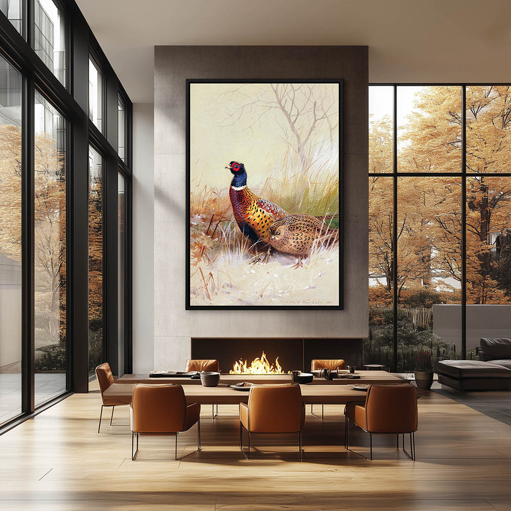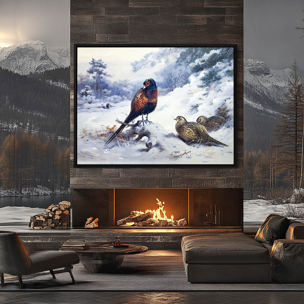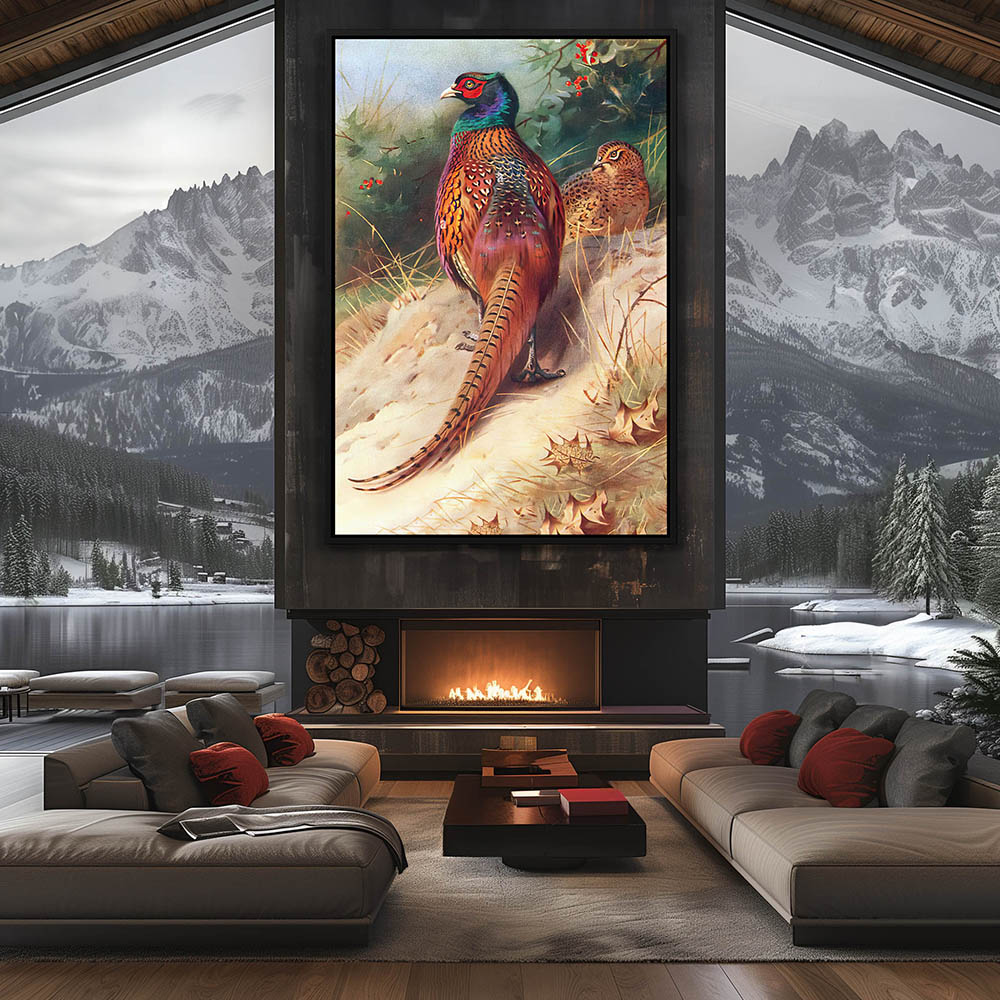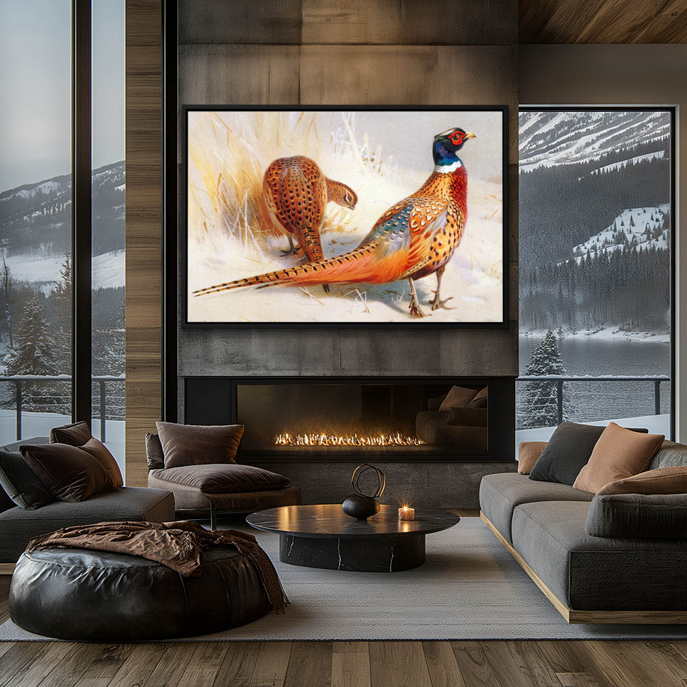 Painting of Cock and Hen Pheasant in the Grass in Winter
