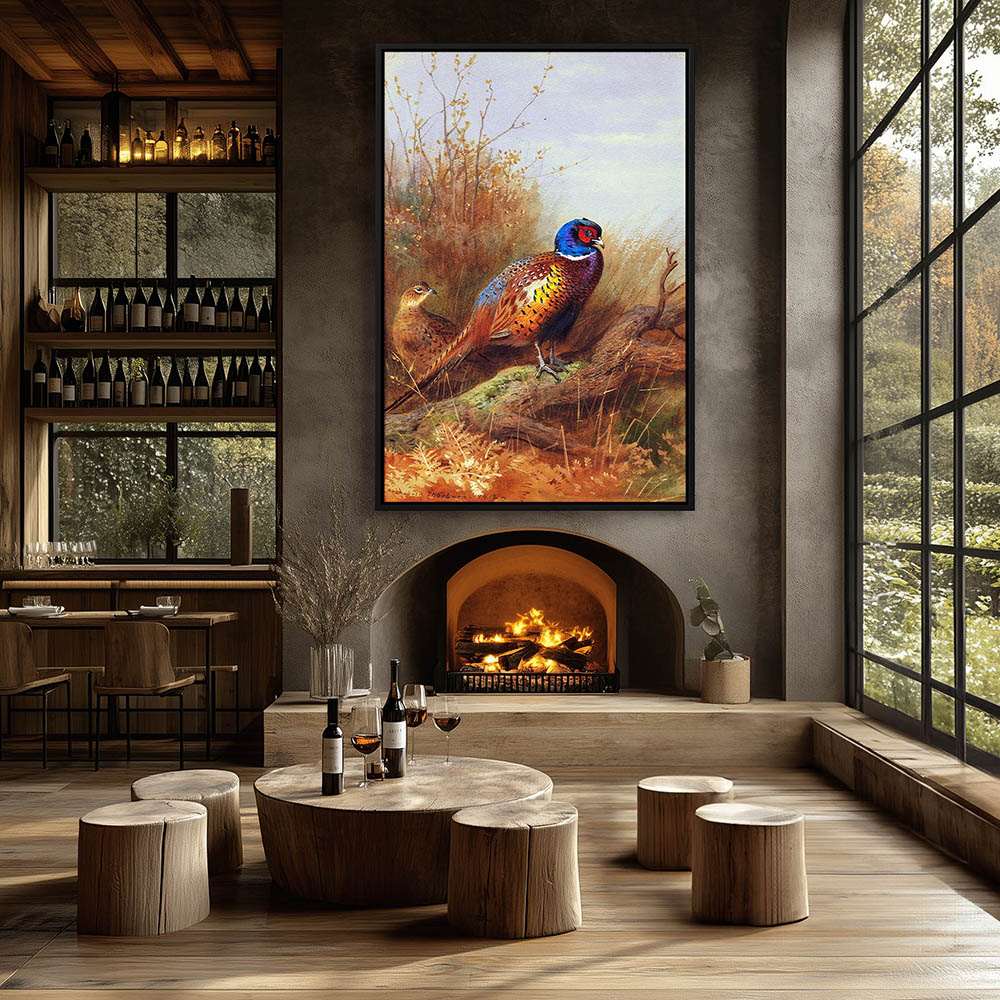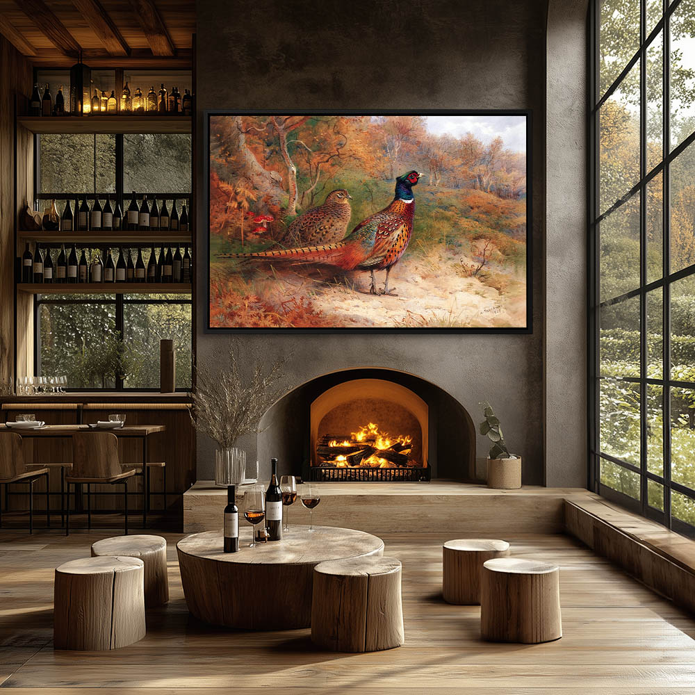 Forest Landscape Painting with a Cock and Hen Pheasant in Autumn