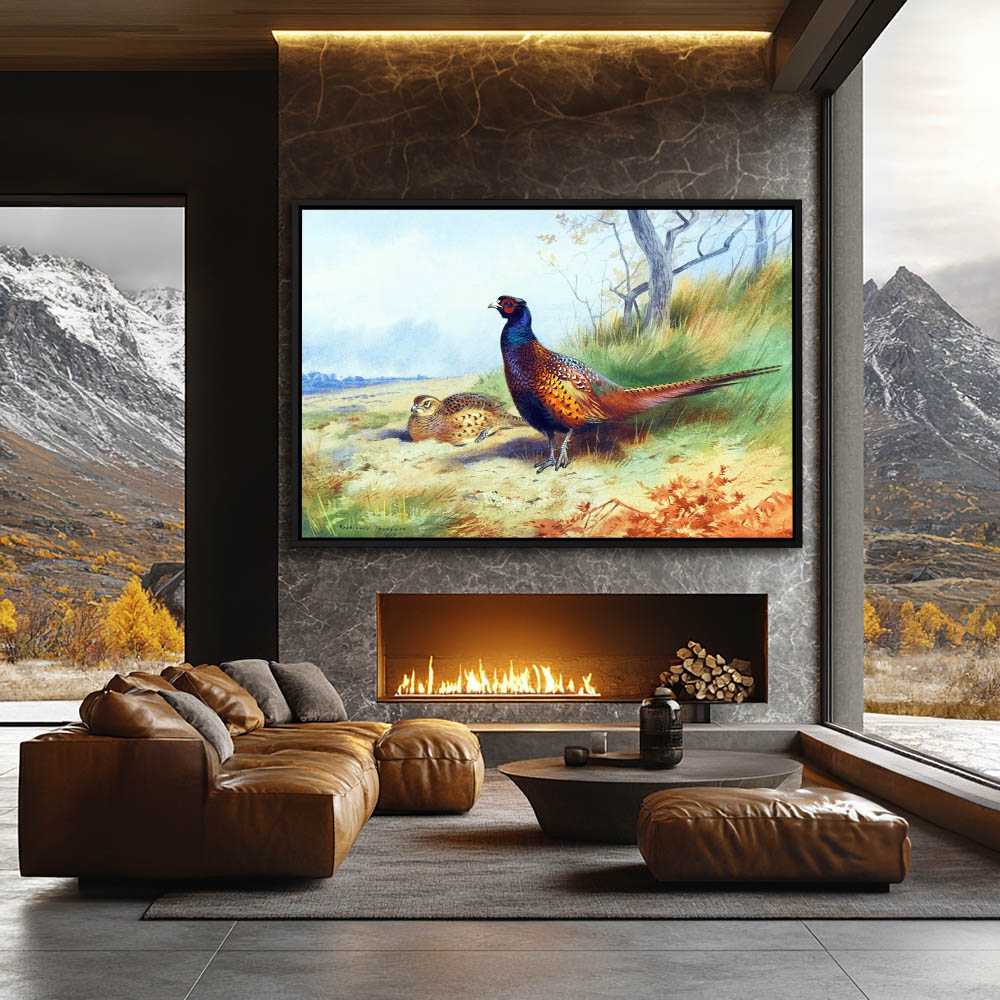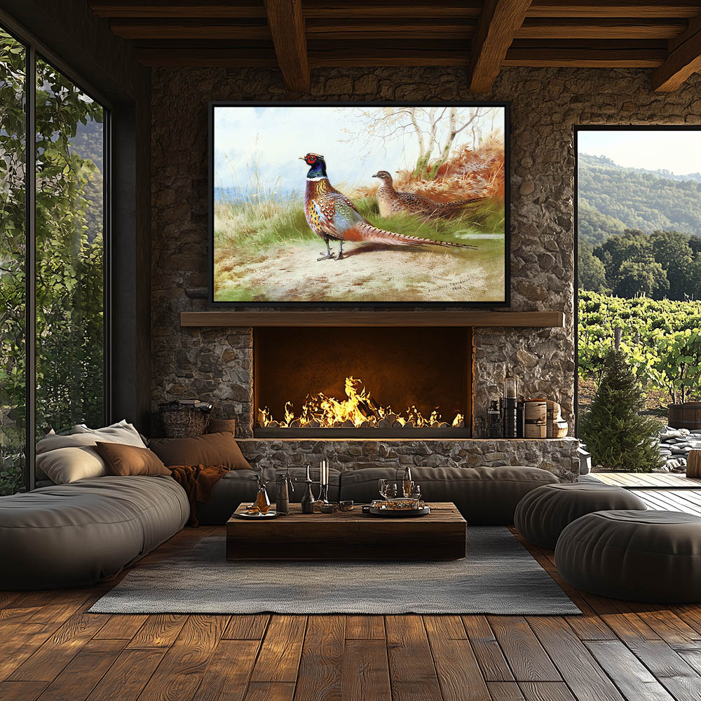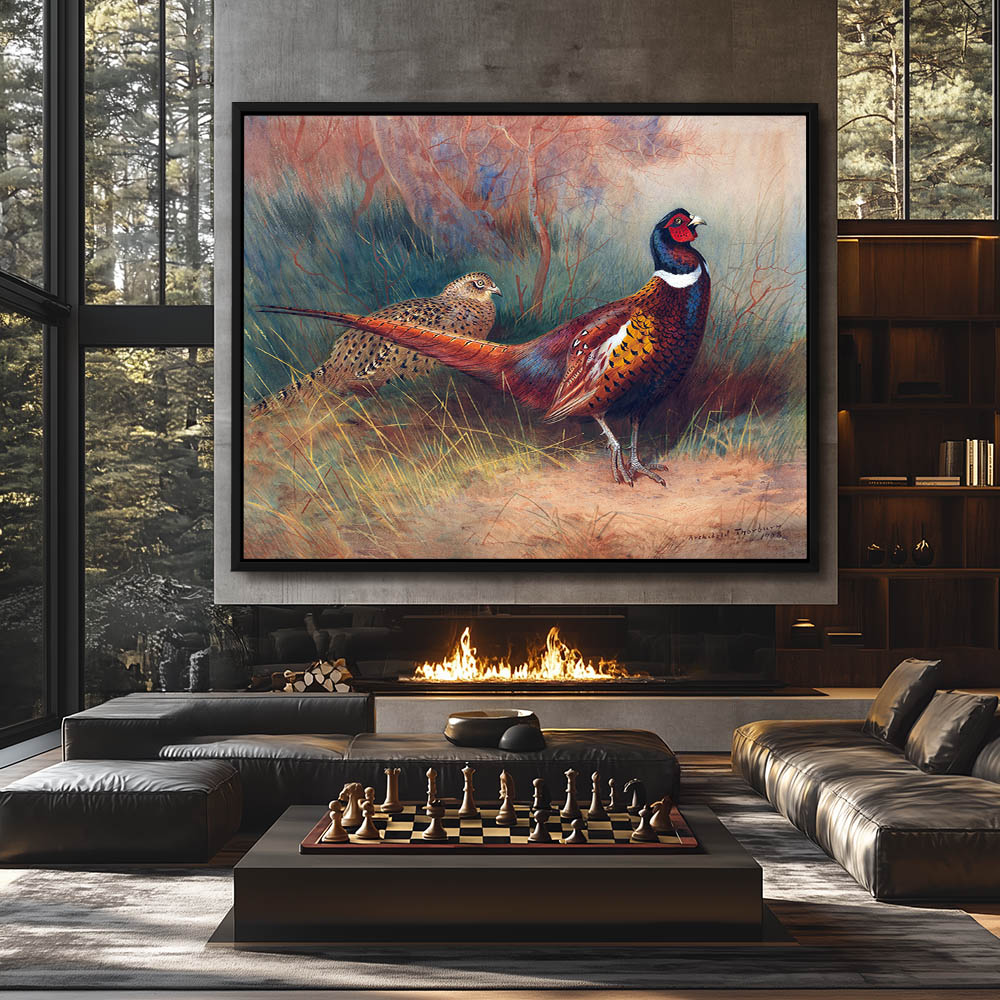 Landscape Painting with a Cock and Hen Pheasant in the Grass