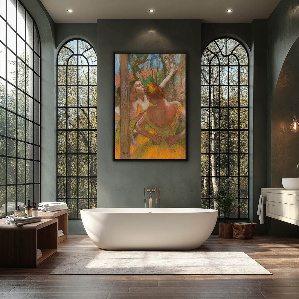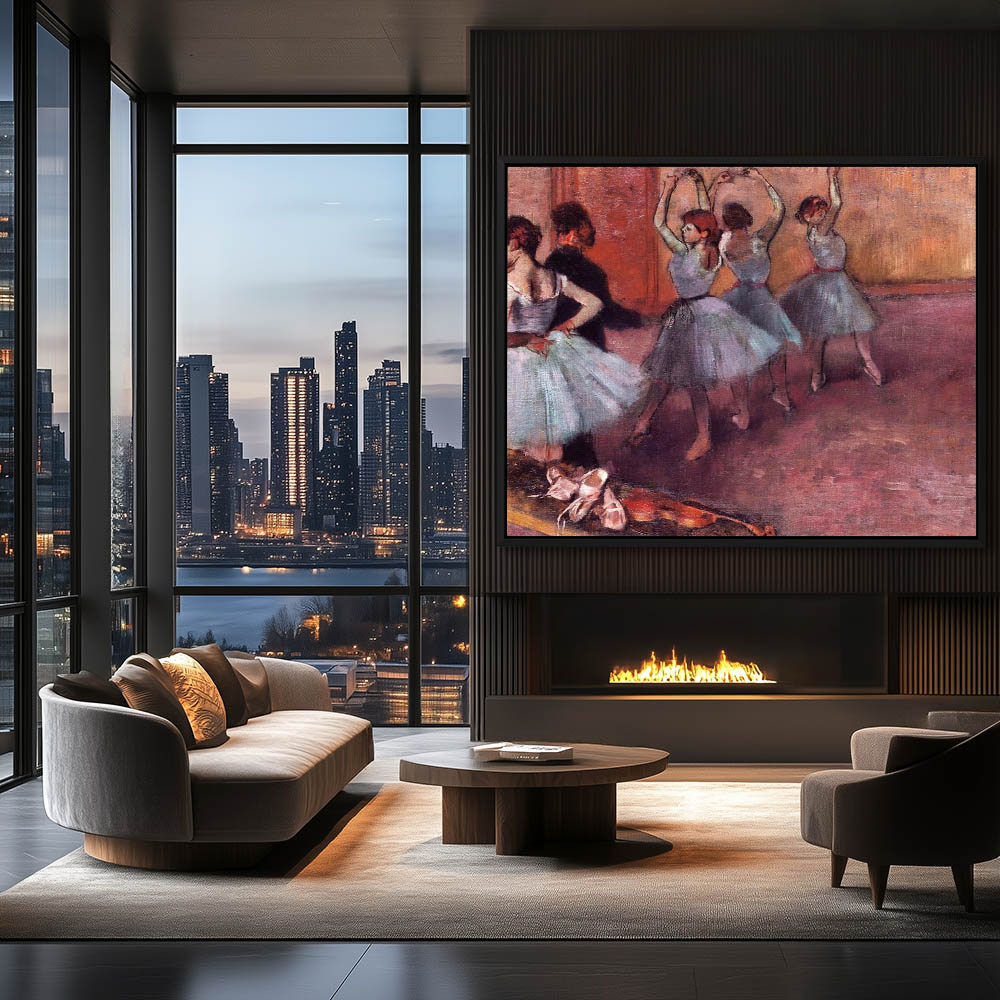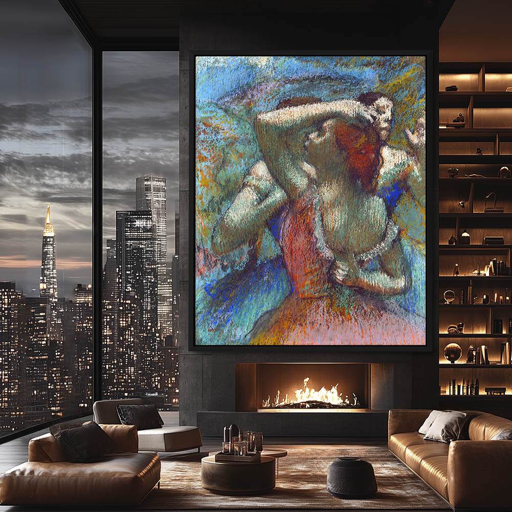 Dancer from behind with one arm raised and the other stretched to the back of her costume