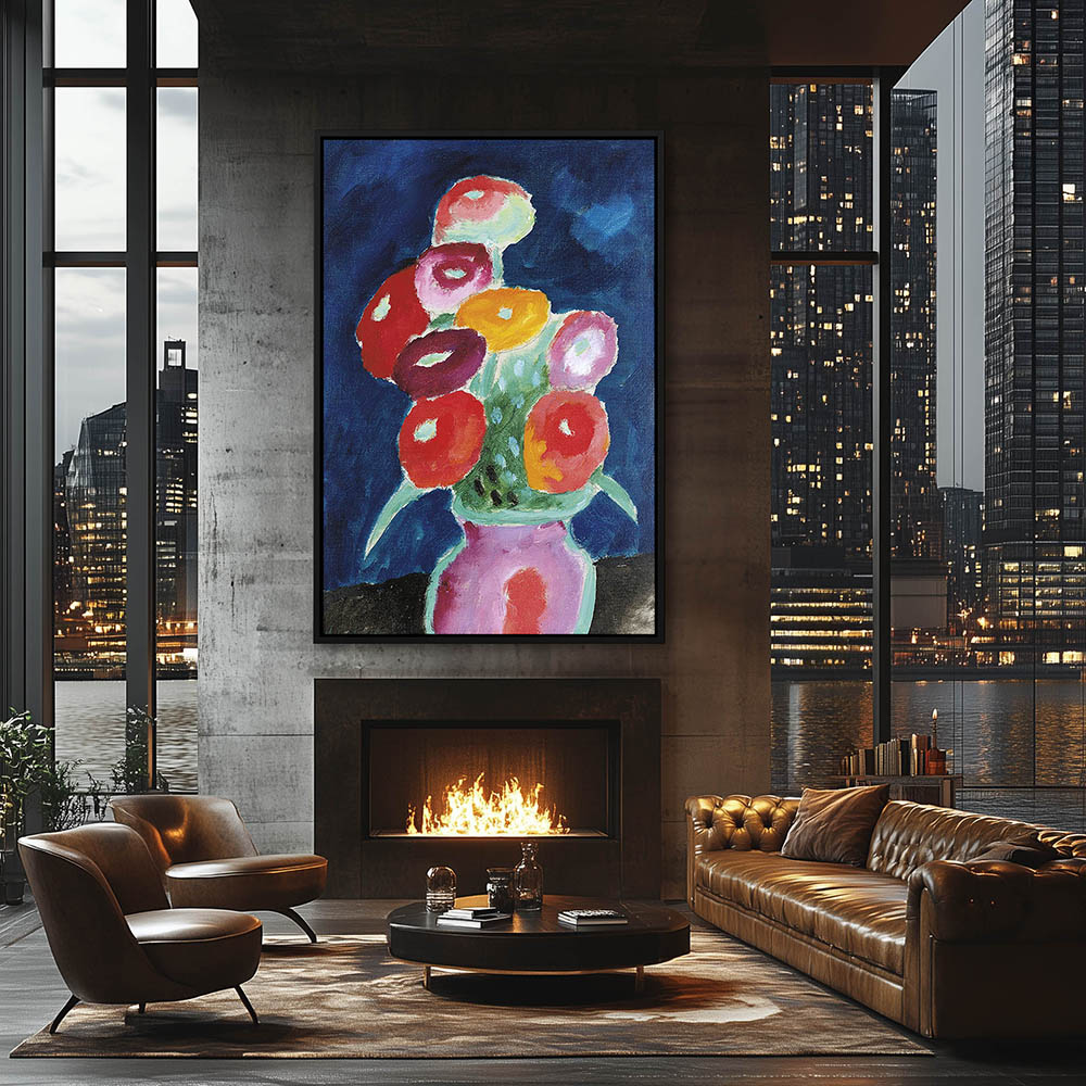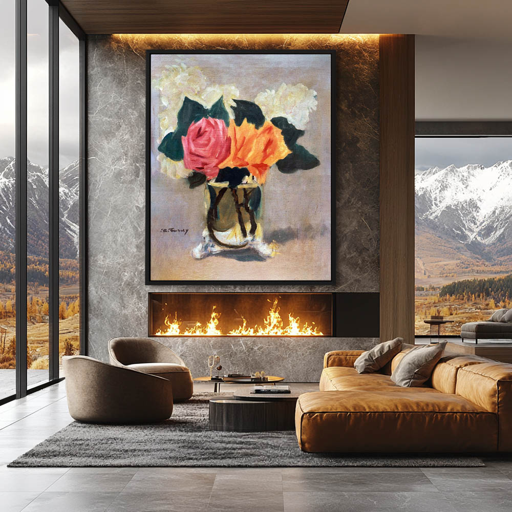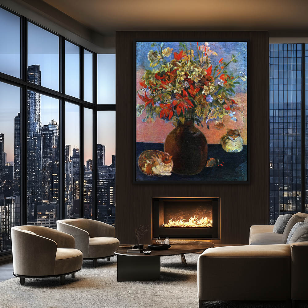 Vintage Still Life Painting with Flowers in a Vase and Cats to the Side