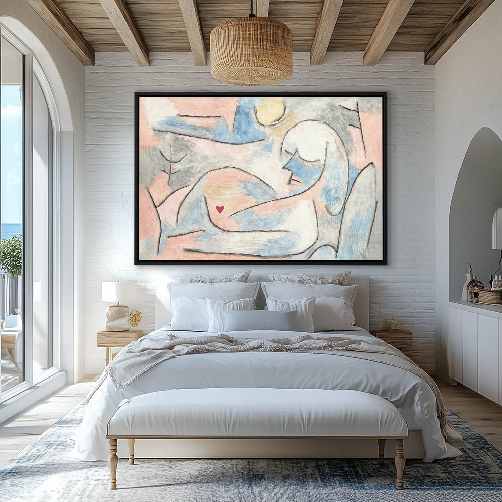 Abstract figure depicted sleeping with a small heart to the side of the figure on a soft colored background