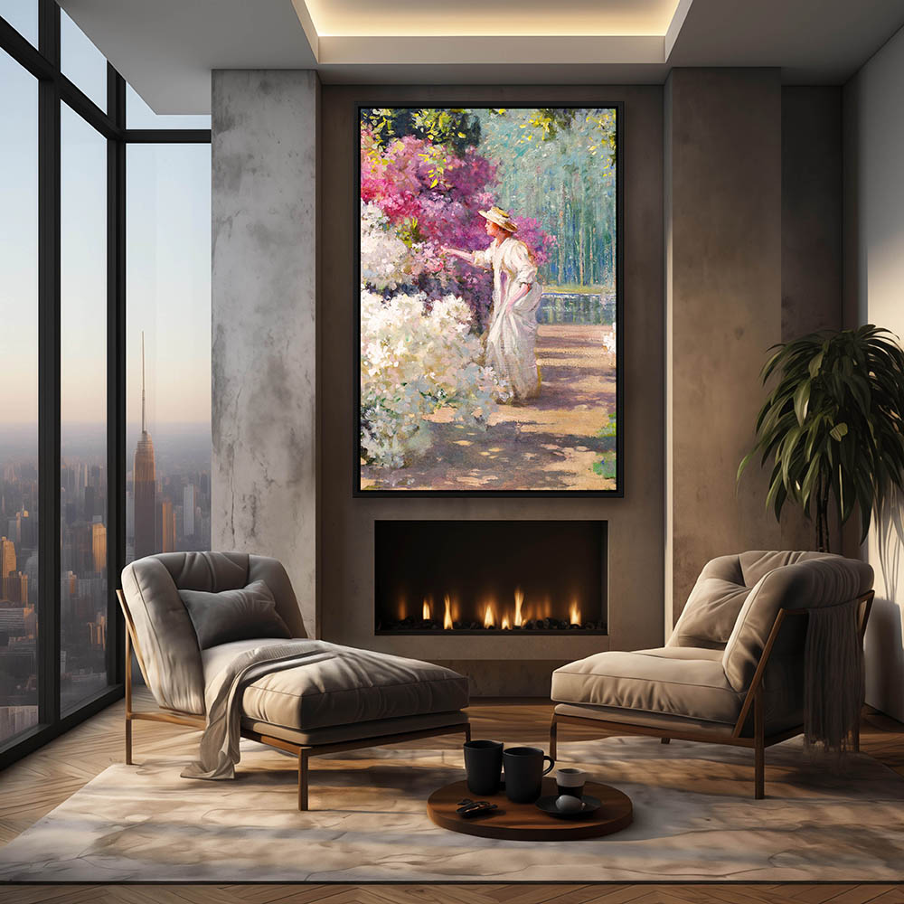 Vintage Flower Painting with a Woman Picking Flowers in the Garden