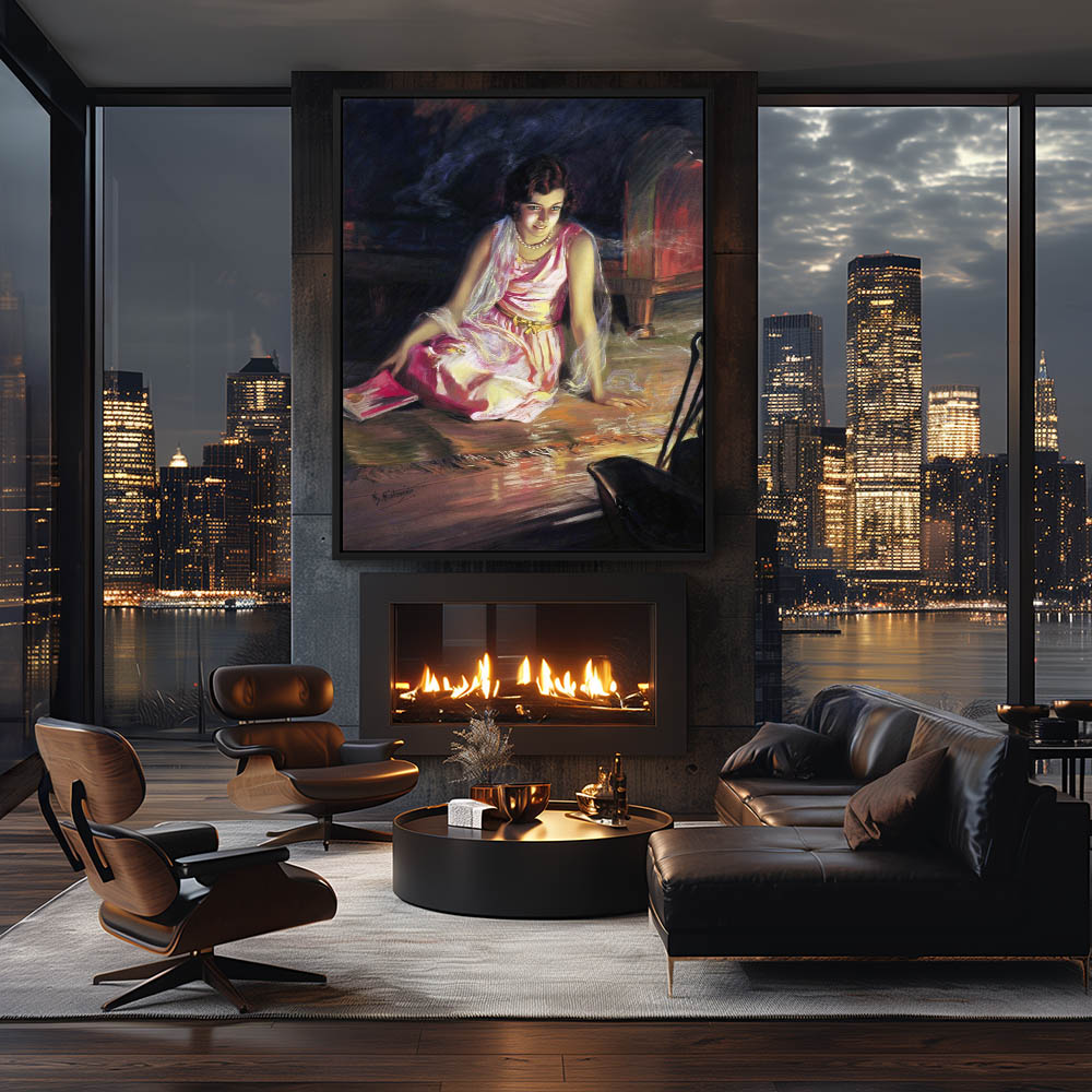 Figurative Painting of a Girl on the Floor in Warming herself in Front of a Fire