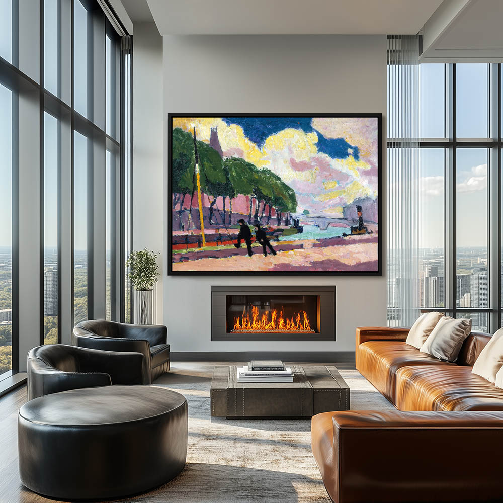 Figures on the bank of a river in an urban setting