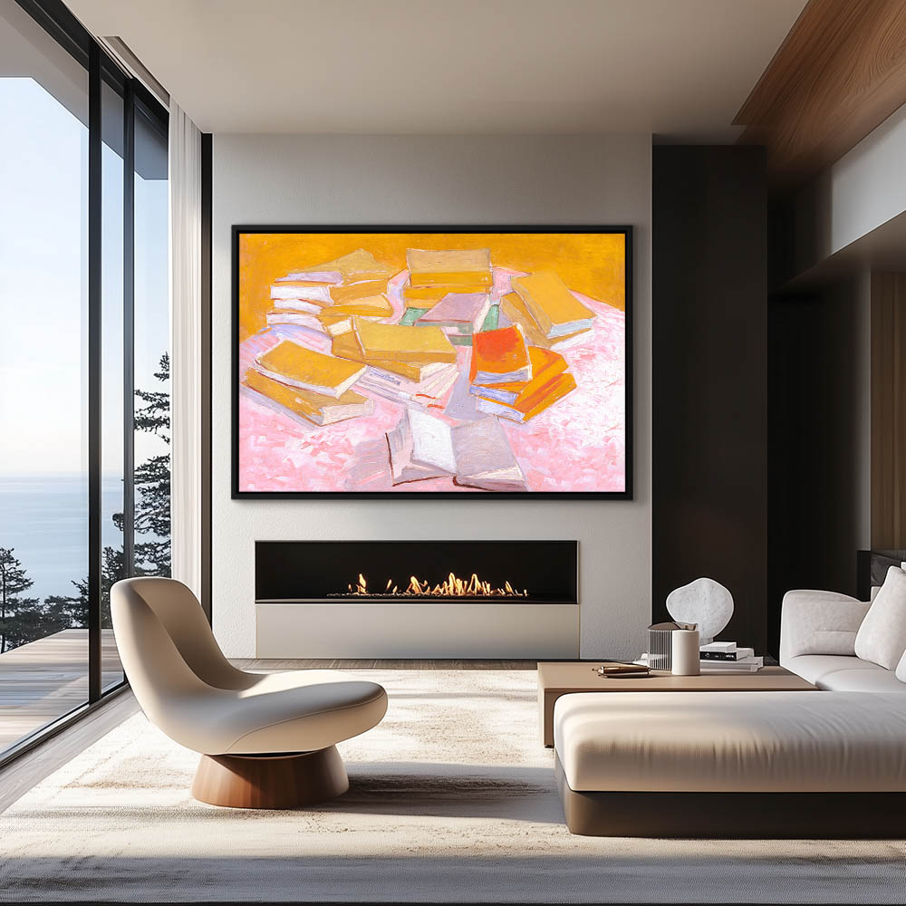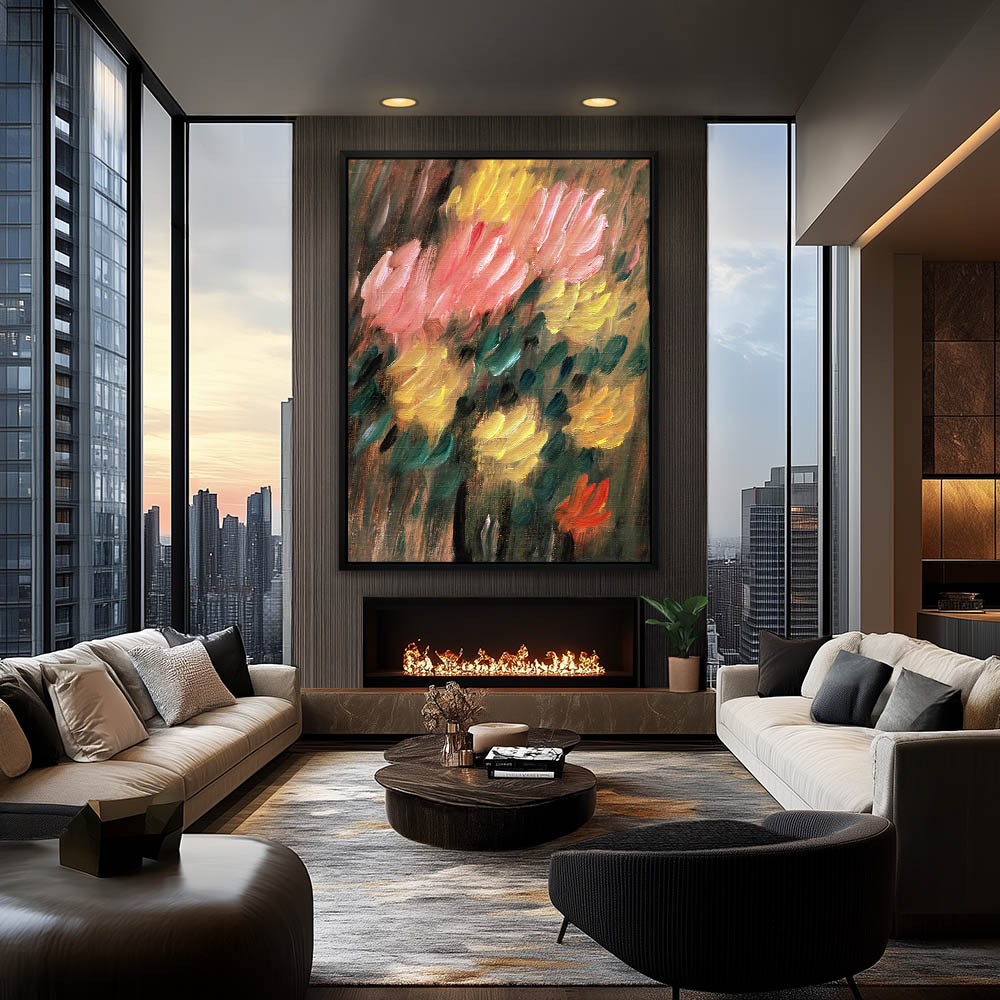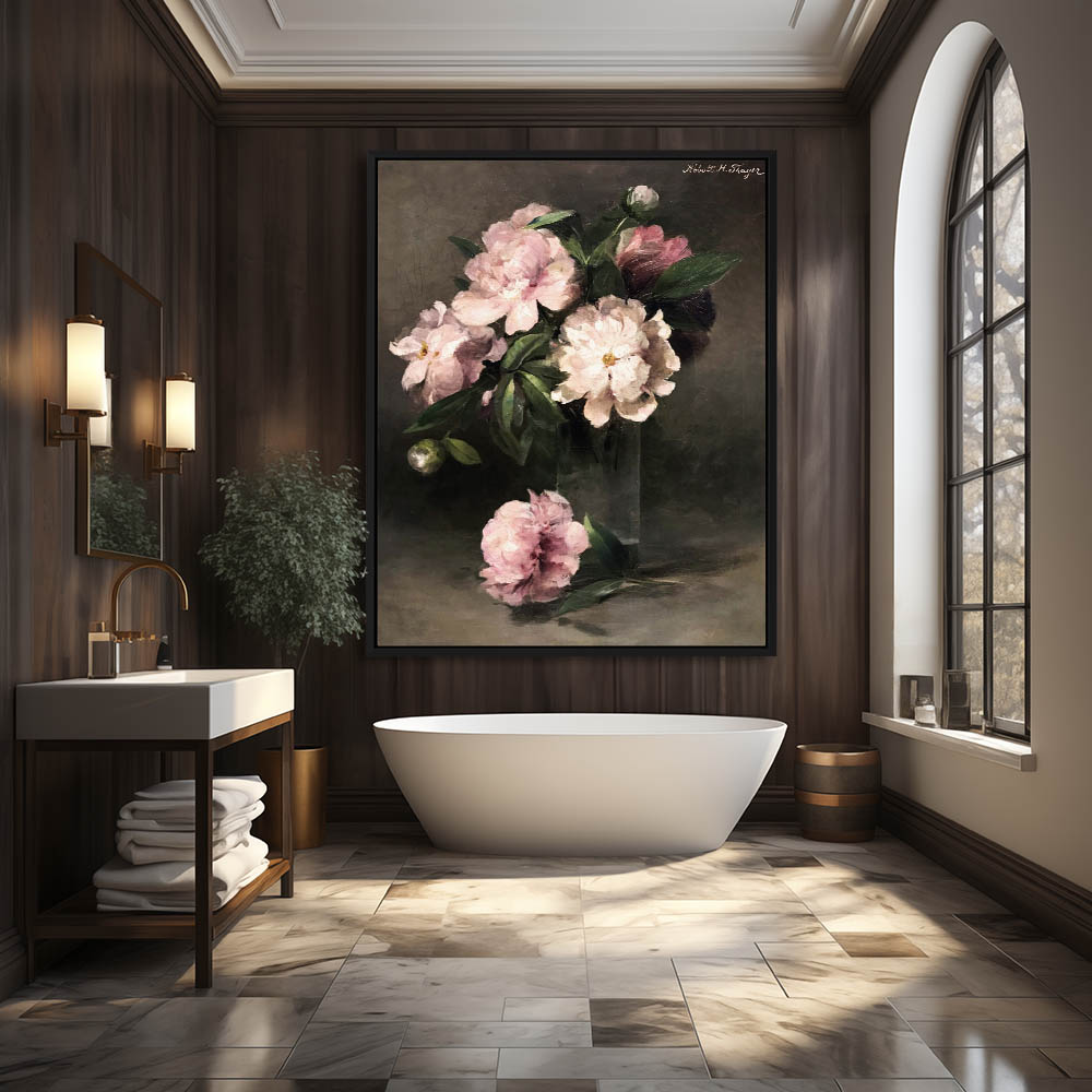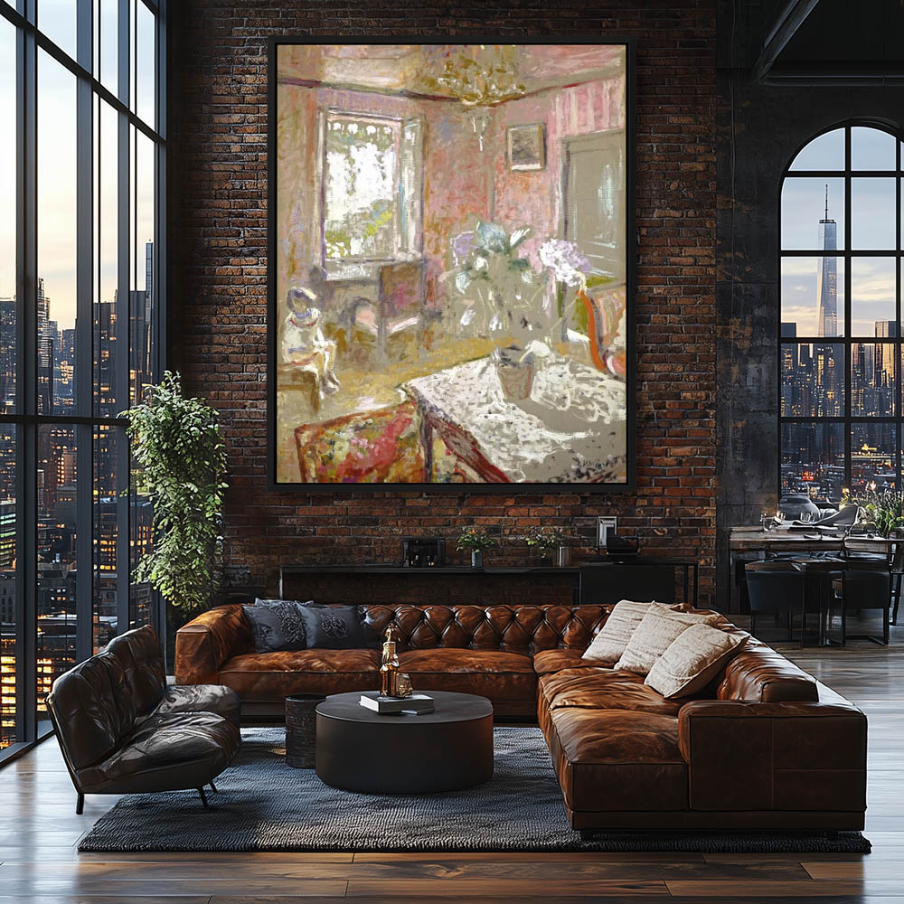 Abstract composition of a pink bedroom with flower arrangement on a table opposite the open window.