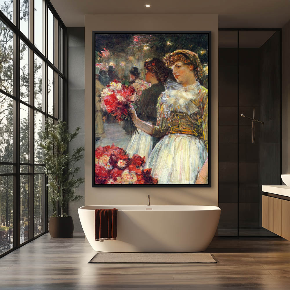 Vintage Figurative Painting of a Girl Picking Flowers by the Sea