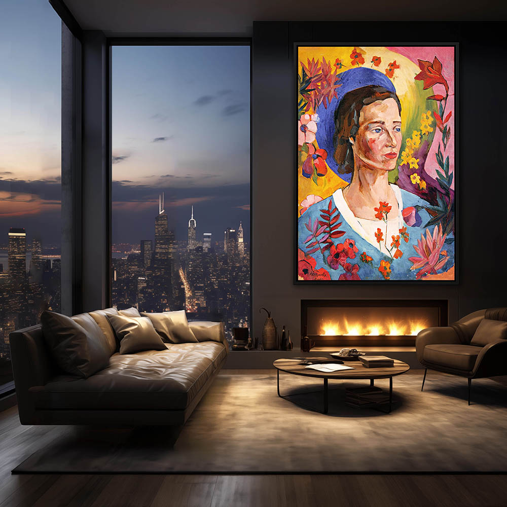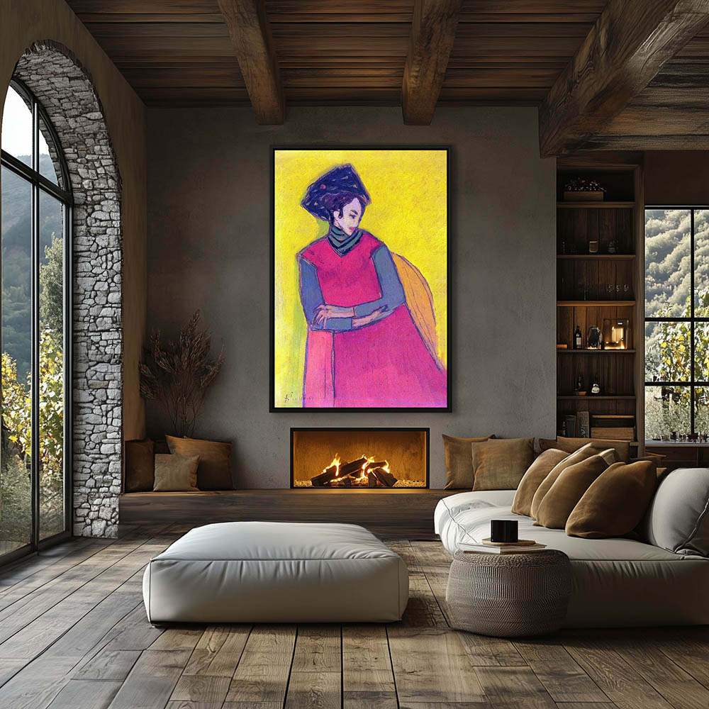 Abstract Portrait Painting of a Woman in Red Dress on Yellow Background