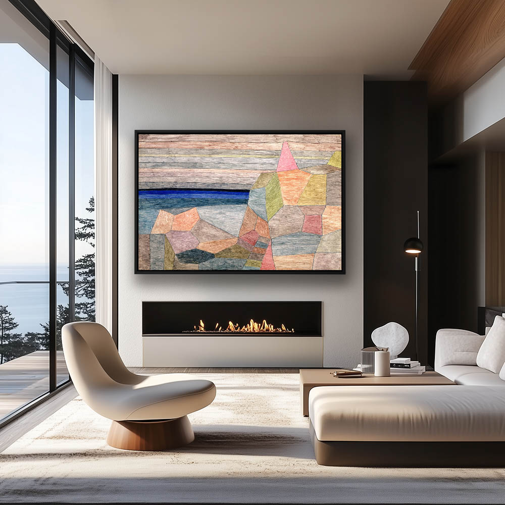 Abstract landscape with large pink rocks and water in the distance