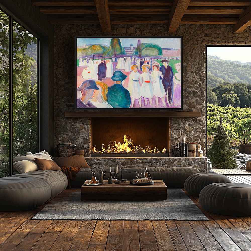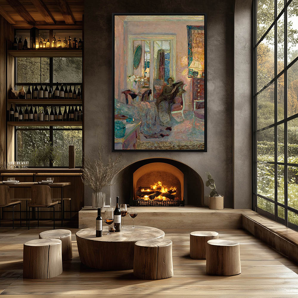 From $29.97Abstract interior with a woman louging on a chaise with her elbow propped up and lamp to her side