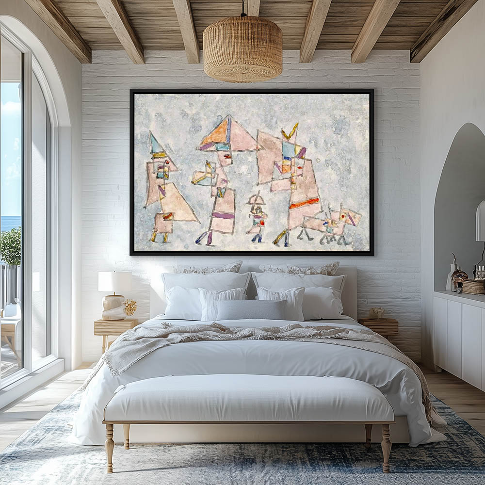 Abstract composition with figures, flags and animals in formation