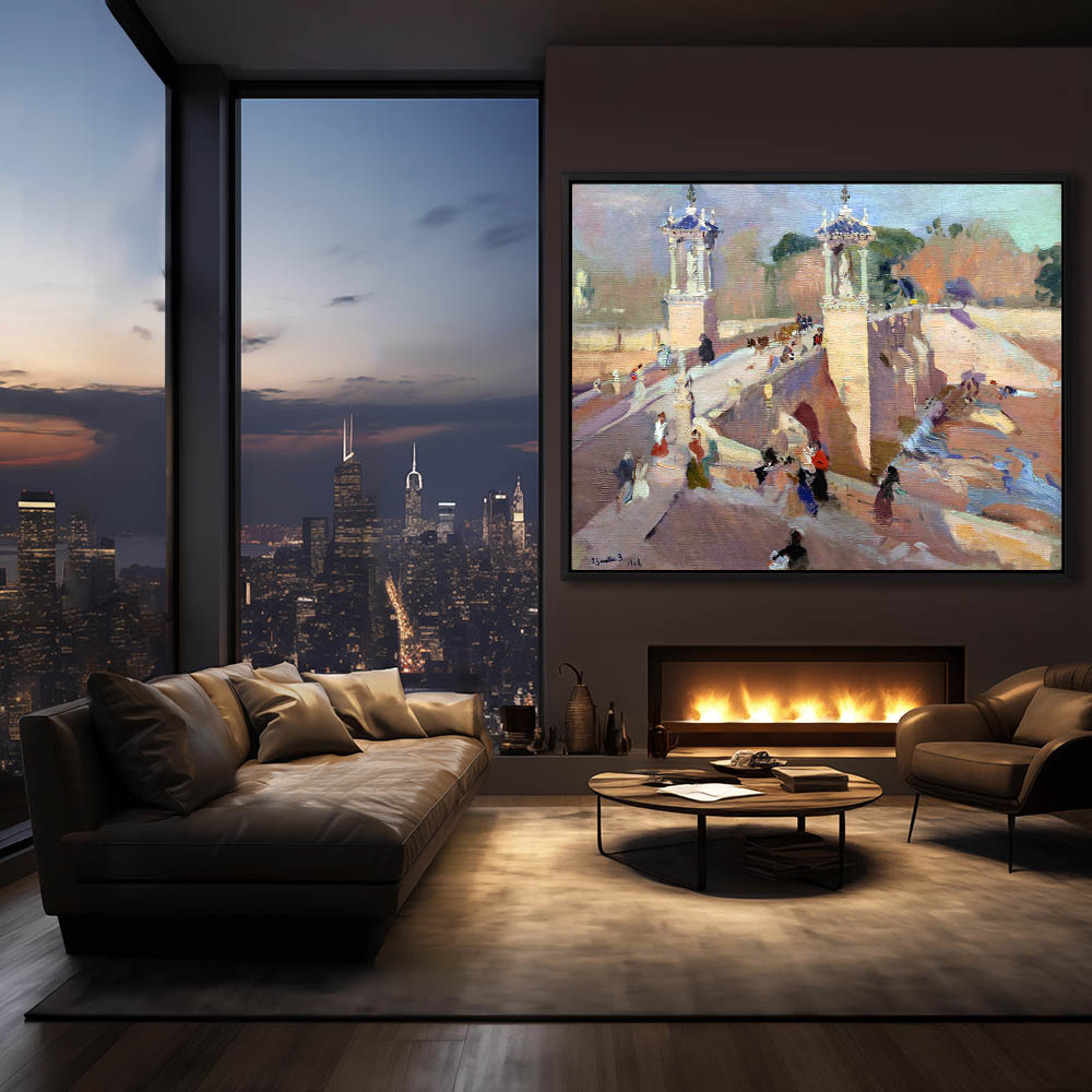 Cityscape scene with figures walking over a bridge