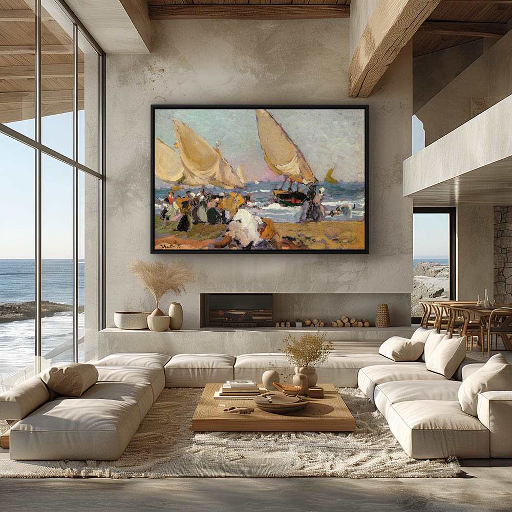 Figures along the shoreline and sailboats in the water