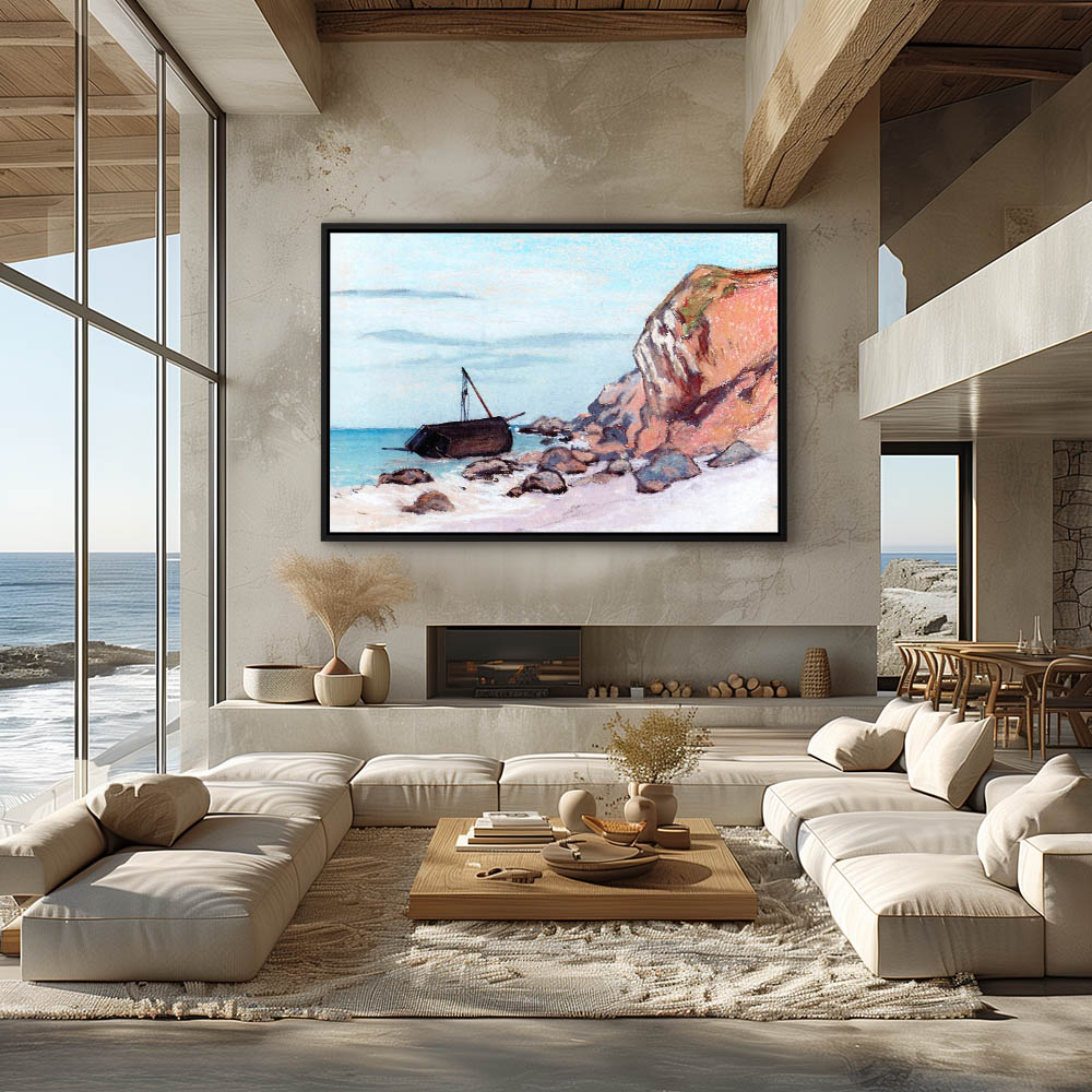 Vintage Seascape Painting with a Beached Sailboat