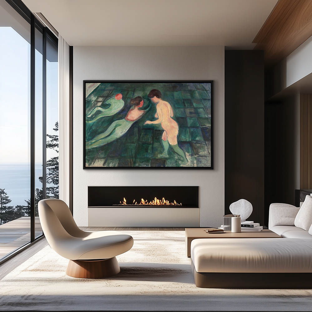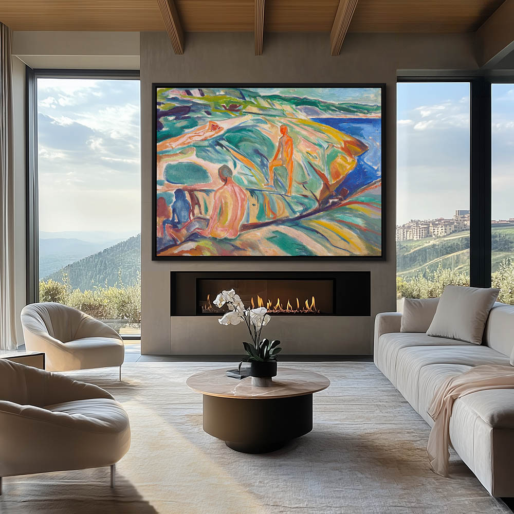 Abstract depiction of male bathers on a rocky shoreline