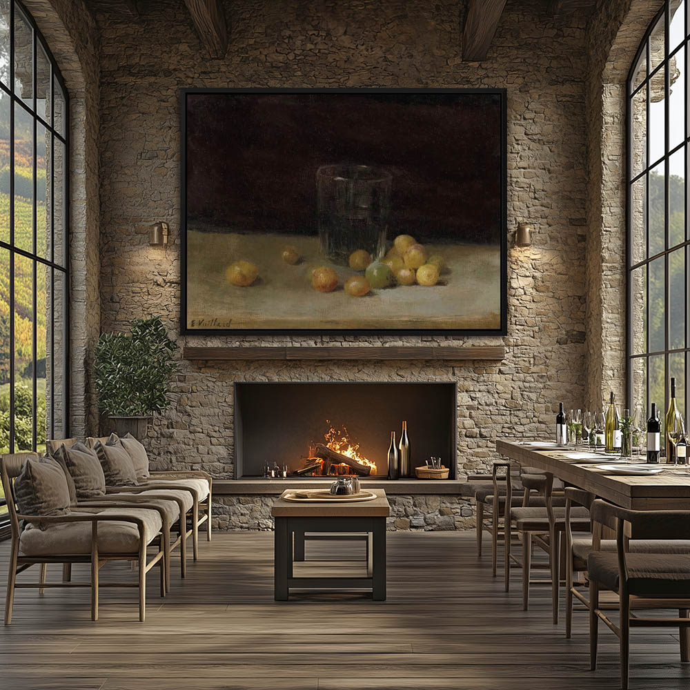 Still life of plums and a water glass