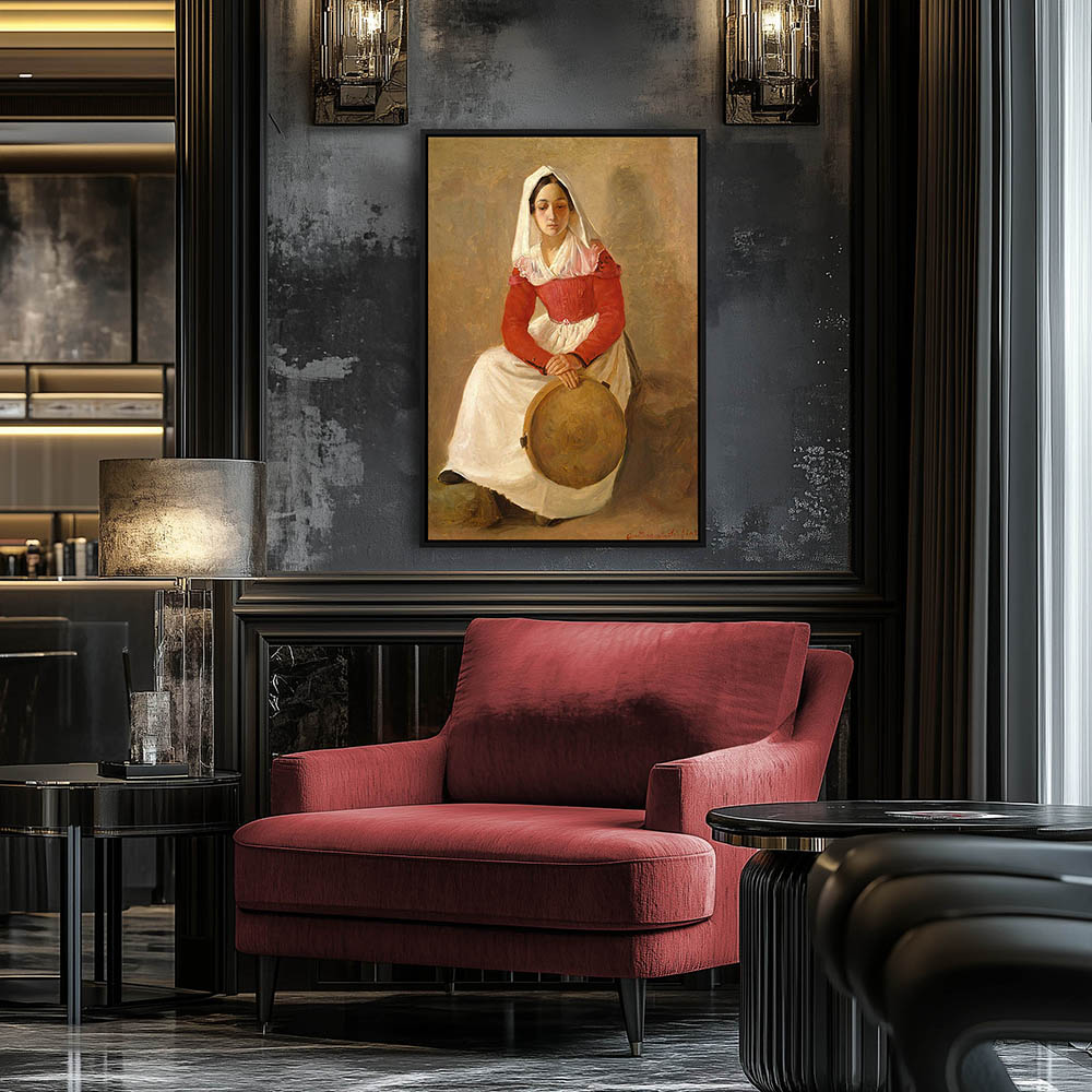 Portrait of a woman in red with a white headscarf and apron, holding a tambourine