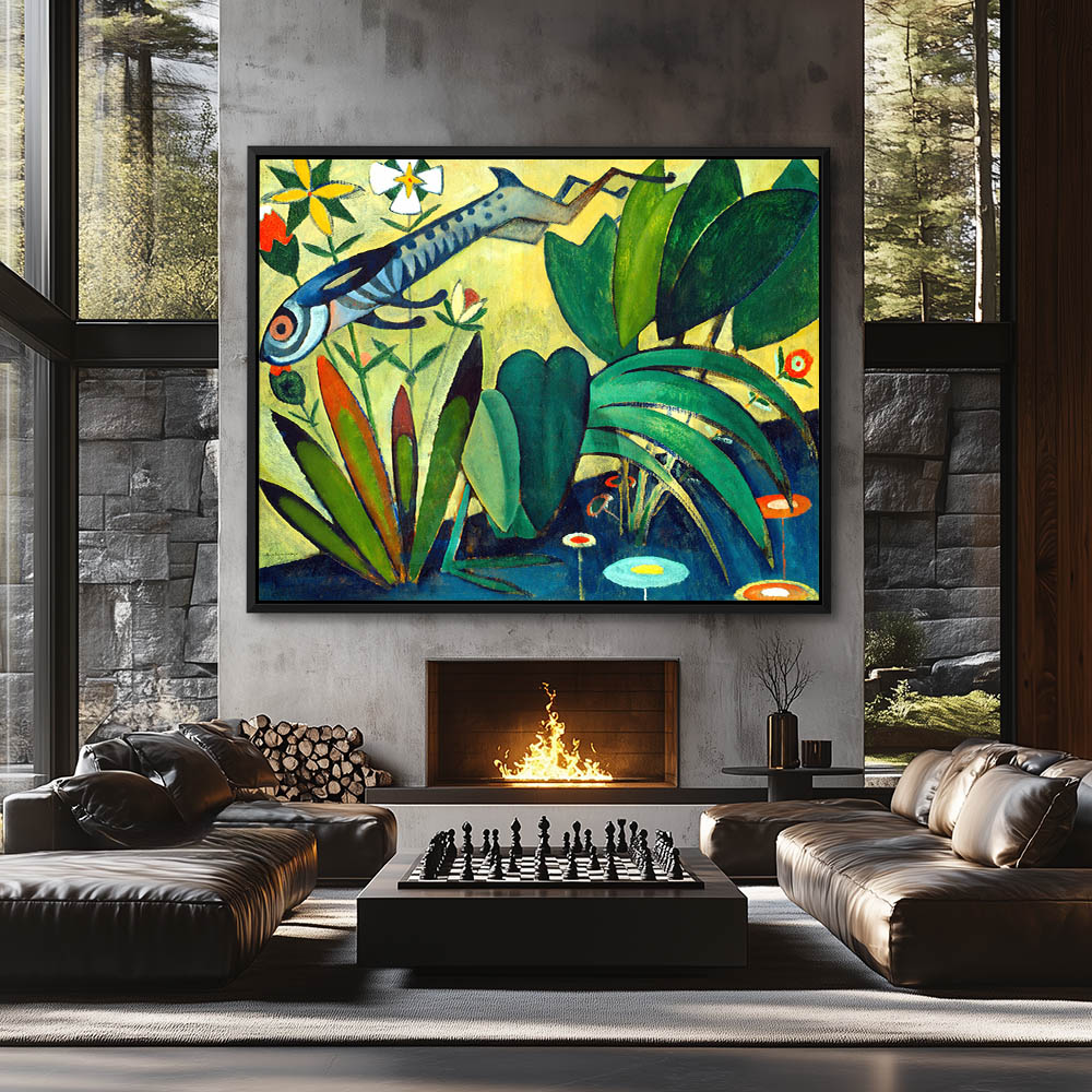 A Stylised nature scene with a jumping rabbit