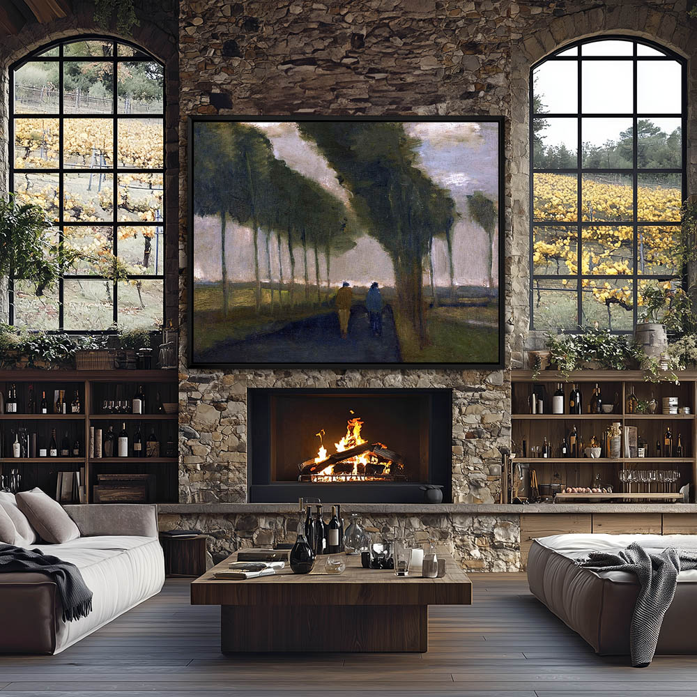 Impressionist Landscape with Two Figures Walking a Tree Lined Lane