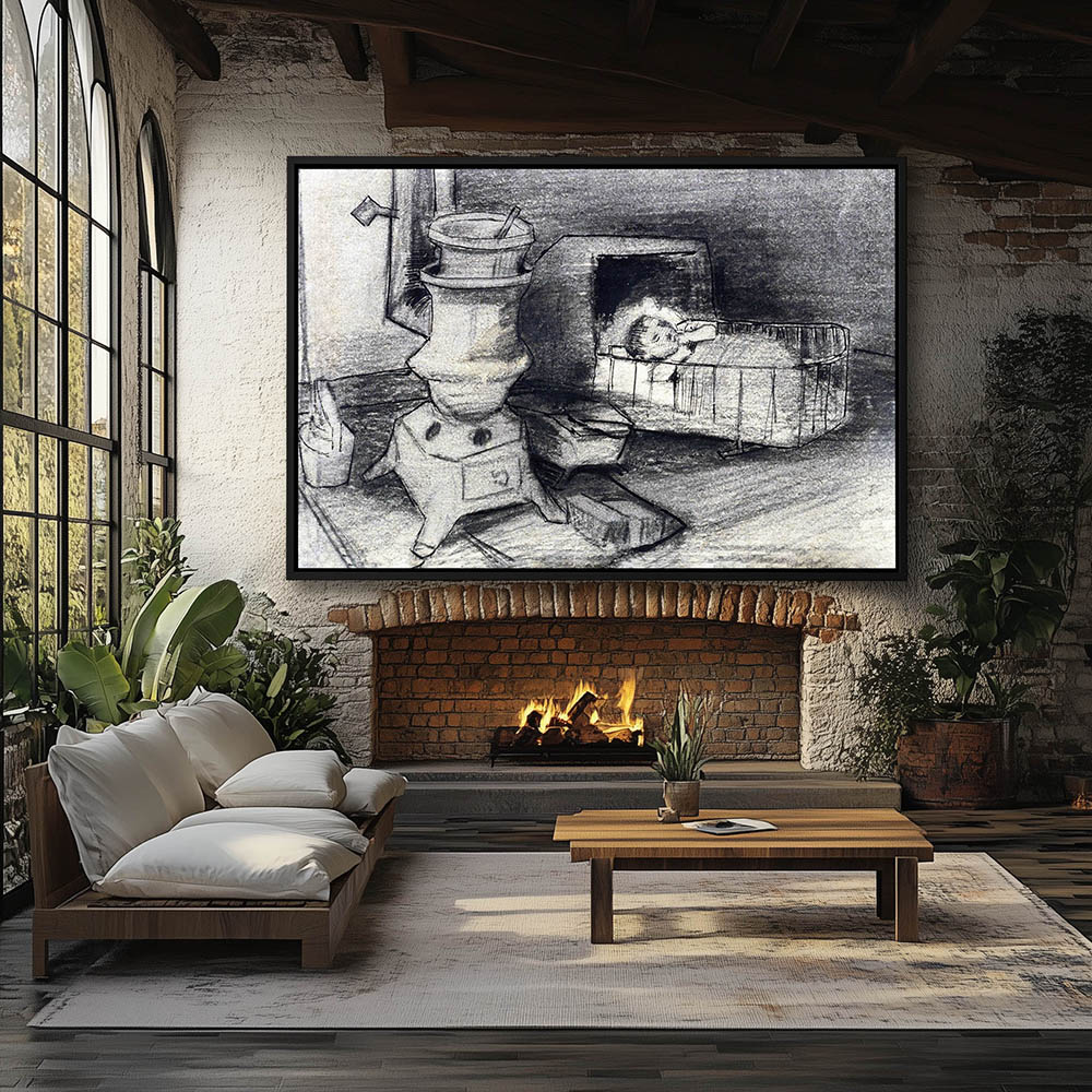 Drawing of the Interior of a Bedroom with a Baby in a Cradle